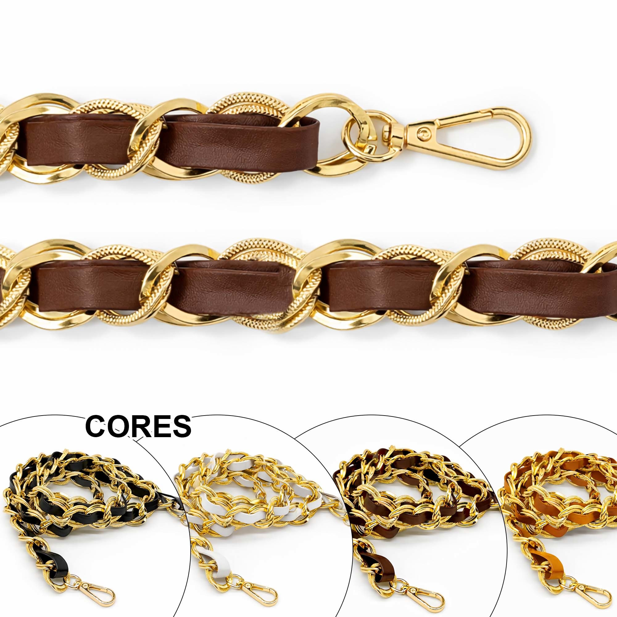 A alça para bolsa corrente com mosquetão é o detalhe que transforma o visual da peça. Com design moderno, mistura corrente dourada em alumínio com acabamento em PU, entregando sofisticação, resistência e leveza na medida certa.