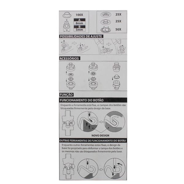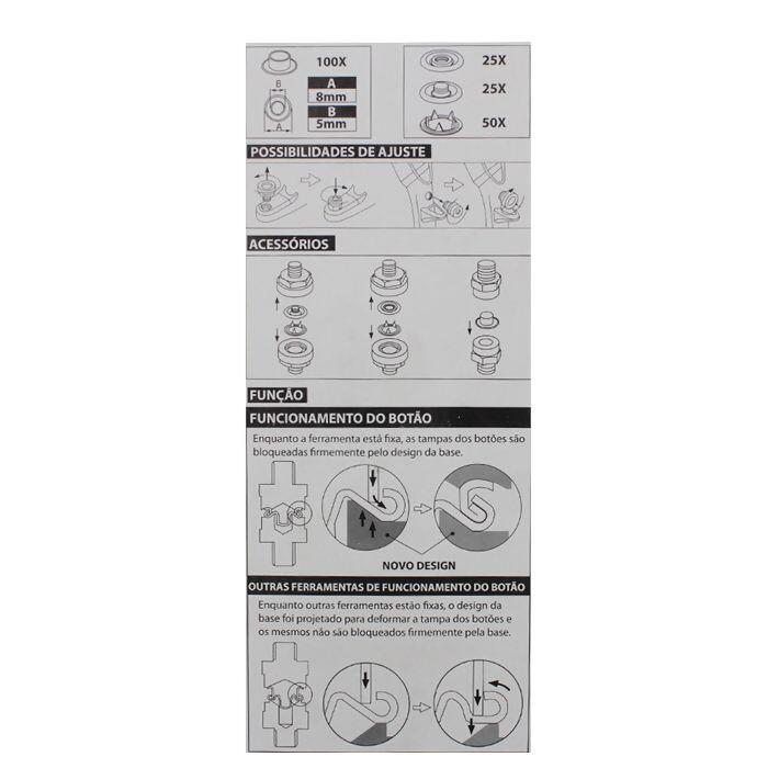 Vem acompanhado de botão de pressão: 5mm e ilhós de 8mm