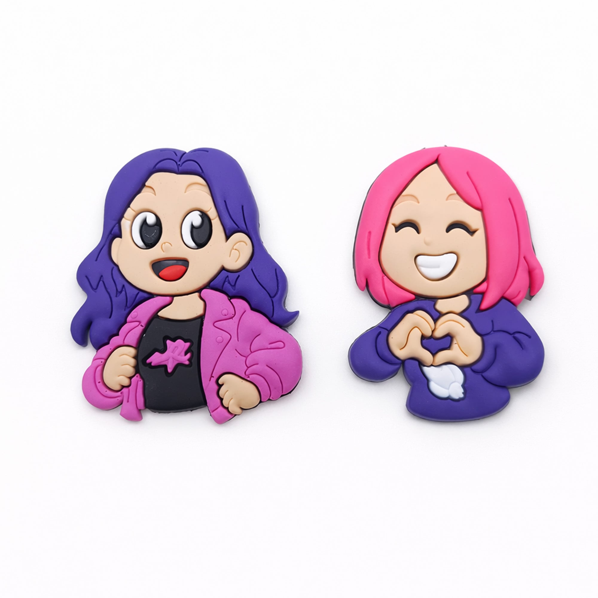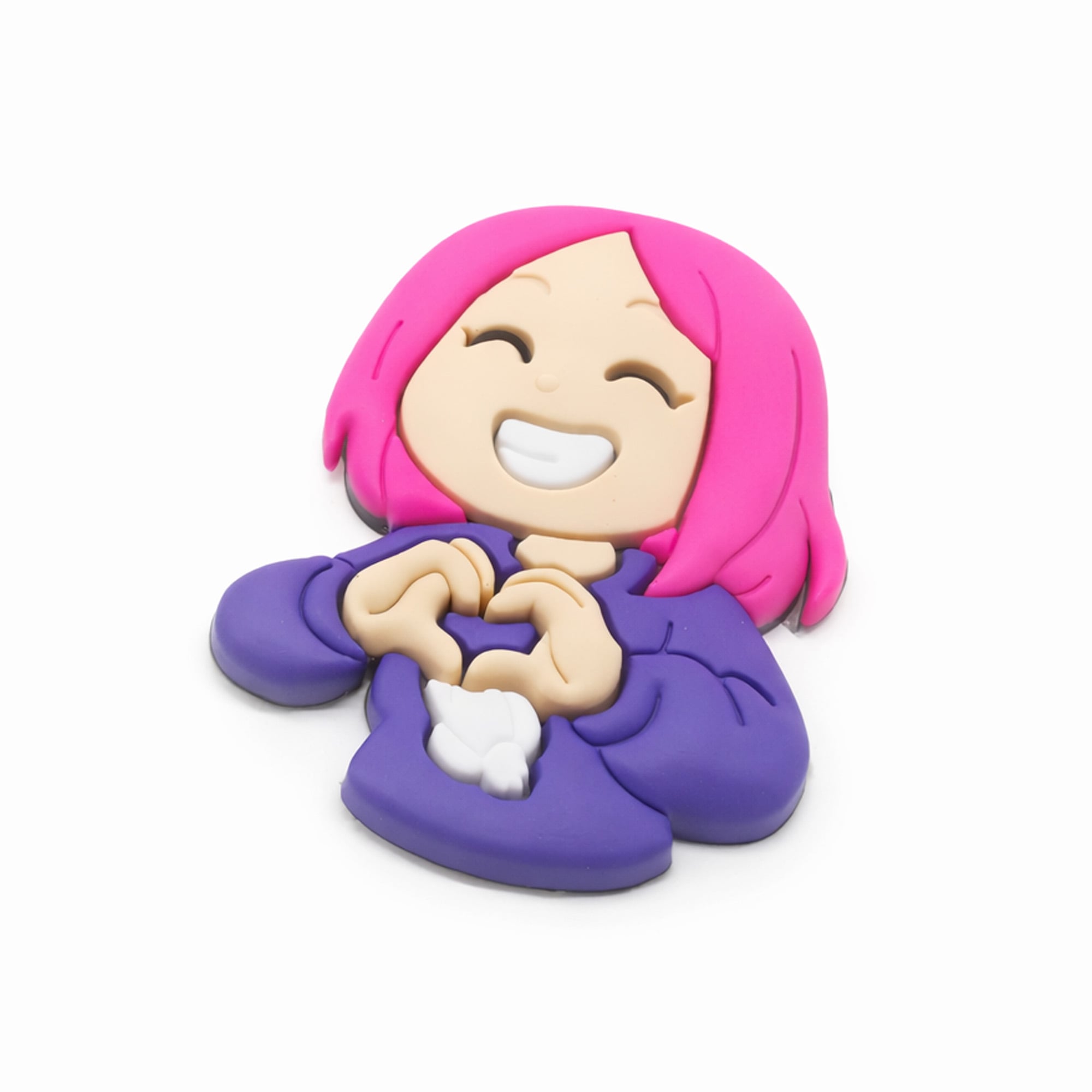 O aplique emborrachado personagem rosa, aplique silicone para artesanato e aplique infantil decorativo é perfeito para quem trabalha com personalização de acessórios e peças criativas. O modelo traz personagens femininas com cores vibrantes, como cabelo rosa e roxo, criando um visual moderno e encantador para trabalhos artesanais.