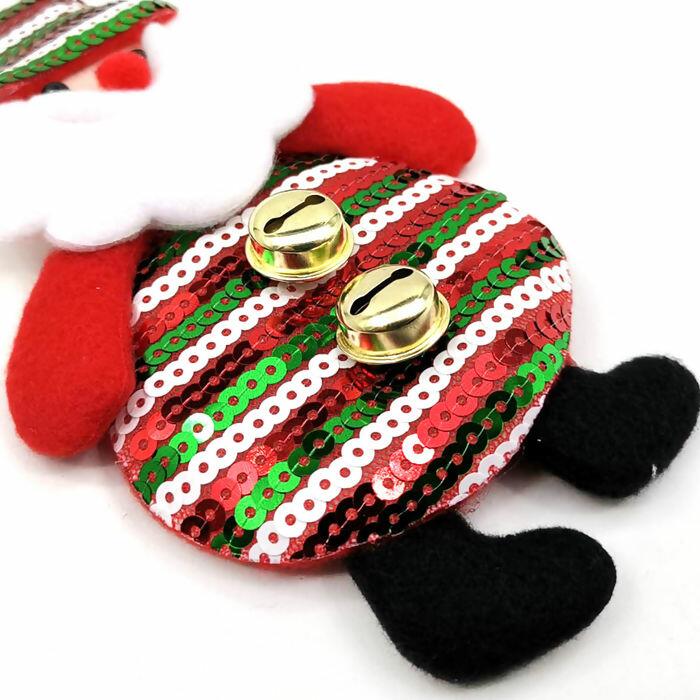 Detalhes: Paetês nas cores natalinas, botões dourados em formato de sino
