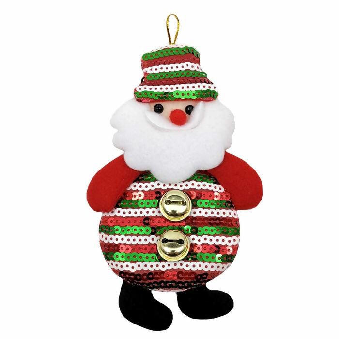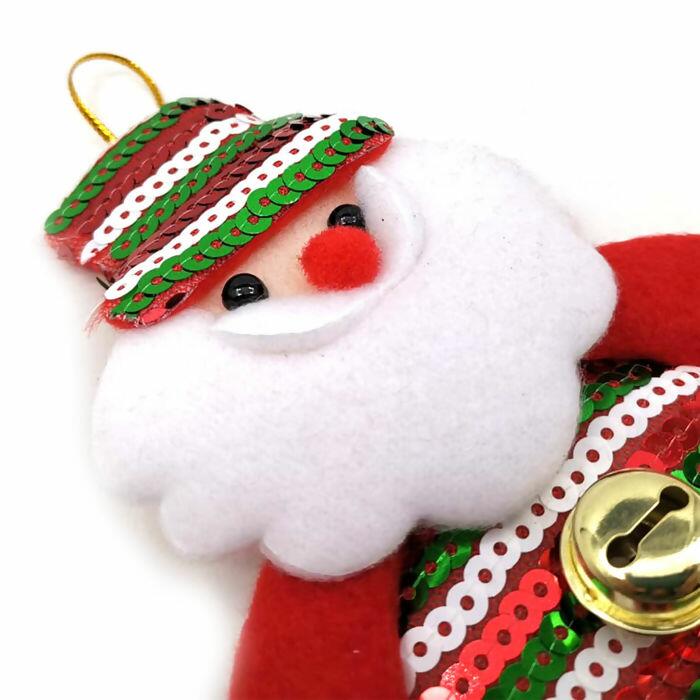 Este lindo aplique em formato de Papai Noel é ideal para deixar a decoração de Natal ainda mais alegre e brilhante. Produzido em feltro macio, ele possui acabamento com paetês coloridos (vermelho, verde e branco), botões dourados em formato de sino e alça dourada para pendurar em árvores, guirlandas ou outros arranjos natalinos.