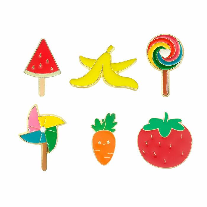 Adicione um toque alegre e criativo às suas peças com os apliques de metal tipo pin com temas de frutas e doces! Em versões coloridas e modernas, esses broches são ideais para customizar roupas, bolsas, estojos e criar composições divertidas para o público infantil ou teen.