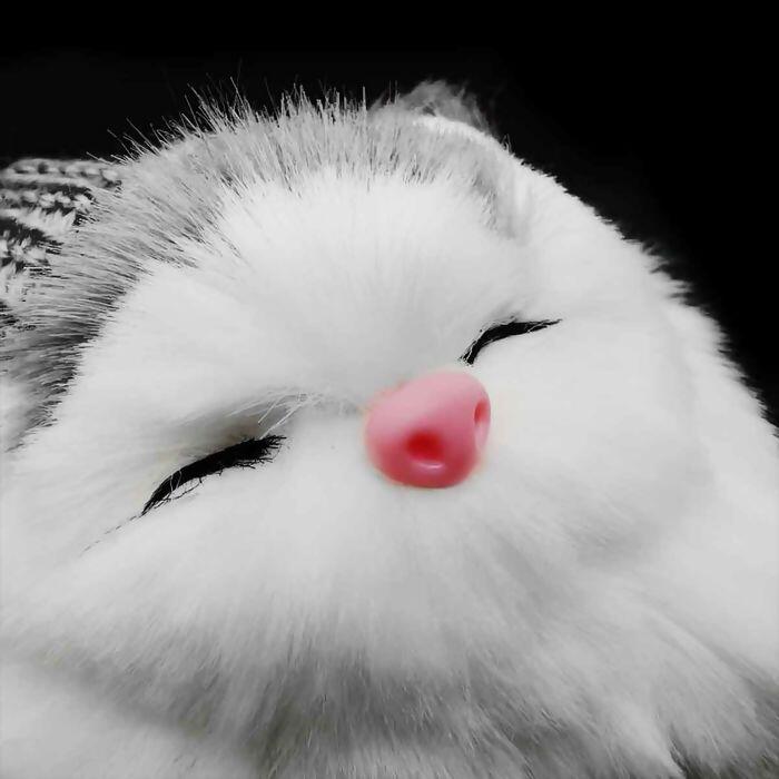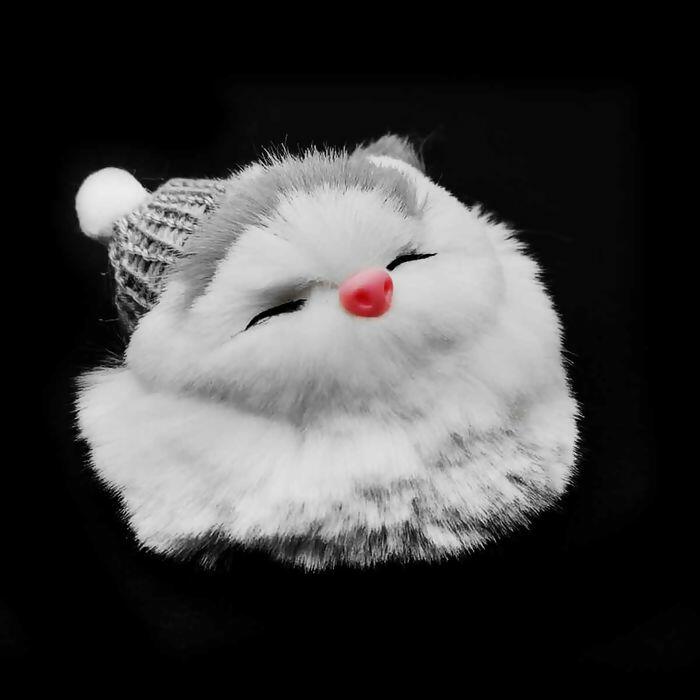 Detalhes: Nariz em plástico, olhos fechados, gorro de lã com pompom