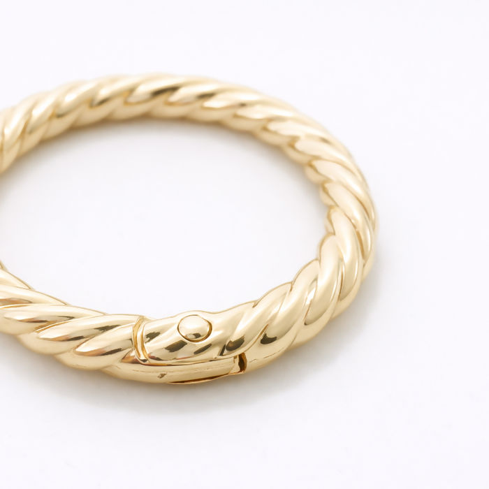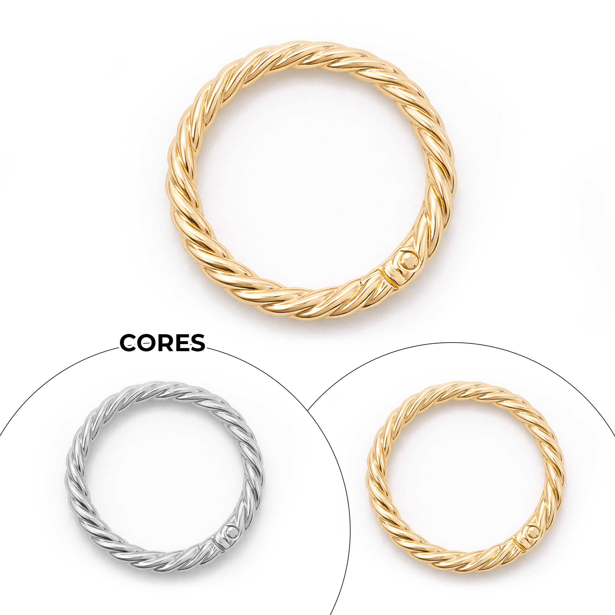 Com 40mm de diâmetro externo e 32mm interno, possui sistema articulado que facilita a aplicação e garante encaixe seguro. Seu design trançado traz um visual sofisticado, valorizando qualquer peça.