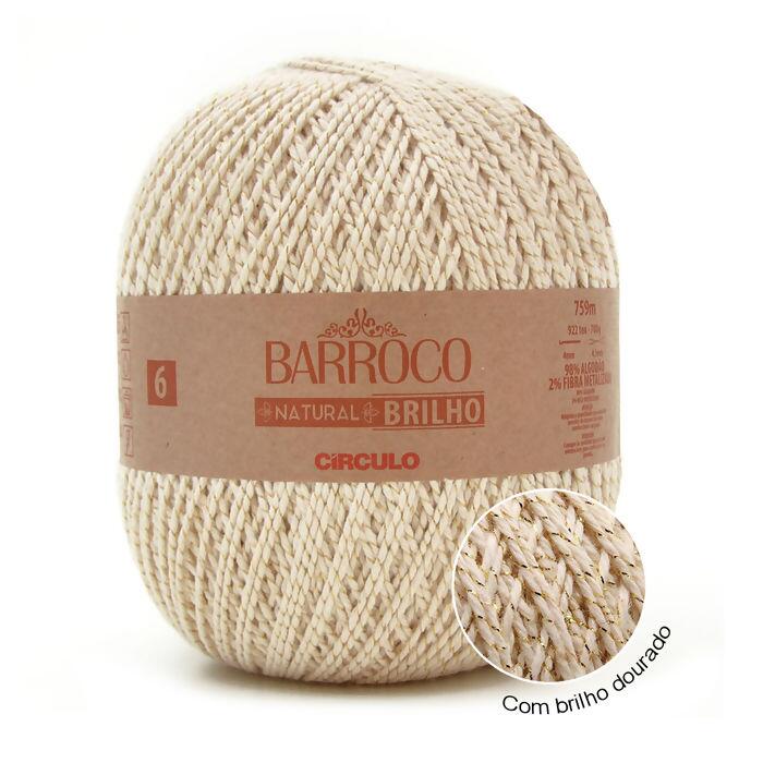 Criado para complementar a família Barroco, o fio Barroco Natural tem toque e maciez incomparáveis com a versão Brilho Ouro e Brilho Prata. Possui 98% Algodão e 2% Fibra Metalizada em diferentes espessuras, para que suas peças tenham mais qualidade e rendimento.