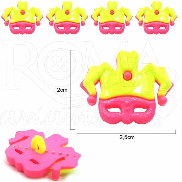 Descrição Botão Infantil de Máscara Carnaval - 25 unidades - Rosa Flúor / Amarelo - 3,5cm x 2,5cm - 1045