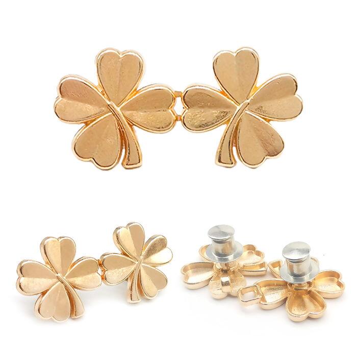 Botão regulável para cintura dourado com design de trevo de quatro folhas. Esse acessório é ideal para ajustar o cós de calças, shorts e saias, oferecendo praticidade e um toque elegante ao visual. Com sistema de encaixe metálico, ele não precisa de costura, sendo facilmente aplicável e removível.