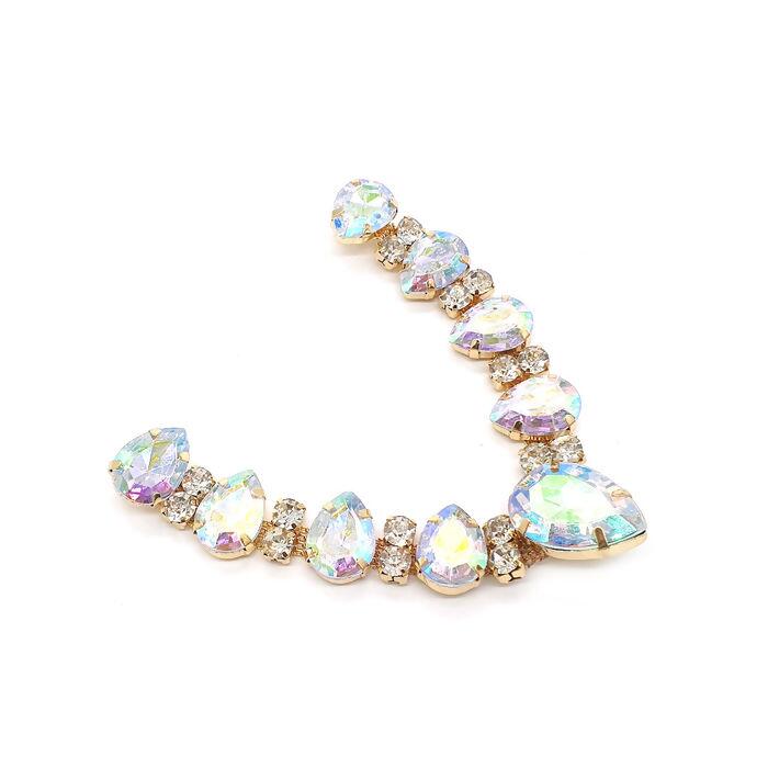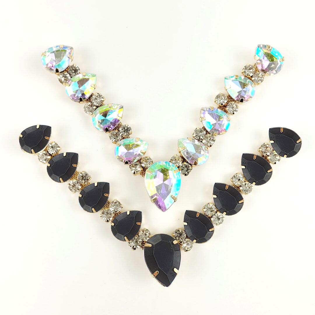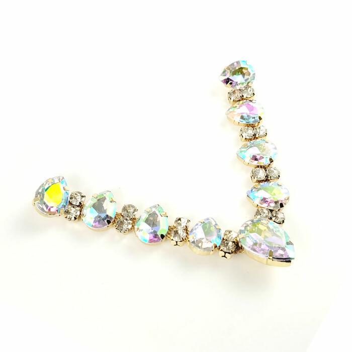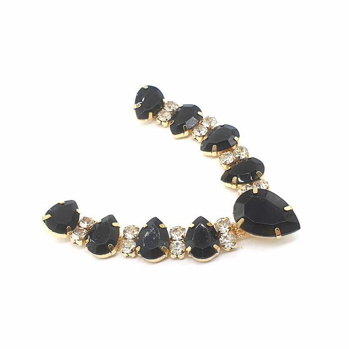 O Cabedal possui um formato em V, na cor dourada com ótimo banho e pedrarias de strass e chatons, fácil de ser aplicado. Não precisa cortar é só costurar e fazer o acabamento com muito carinho.