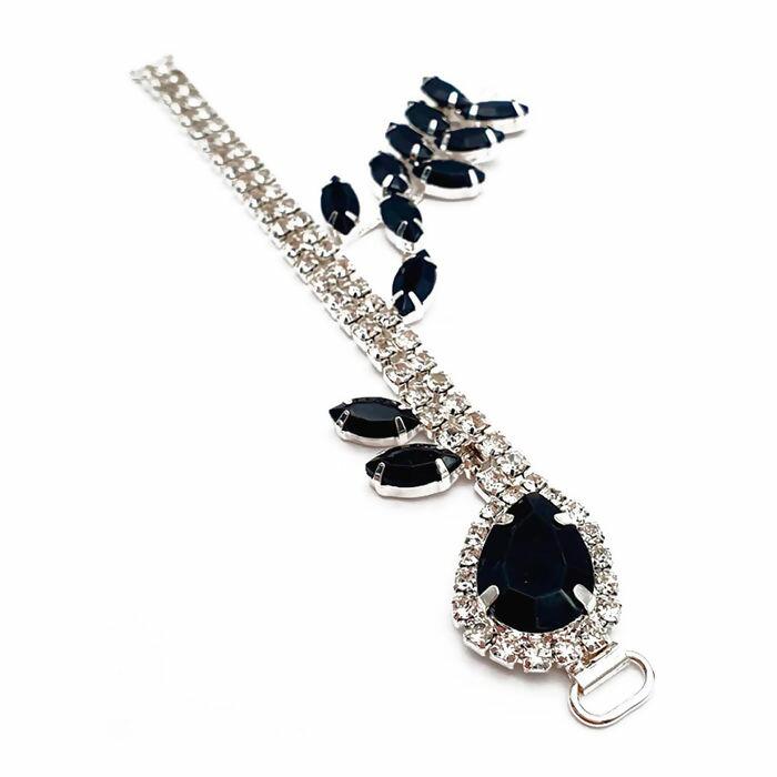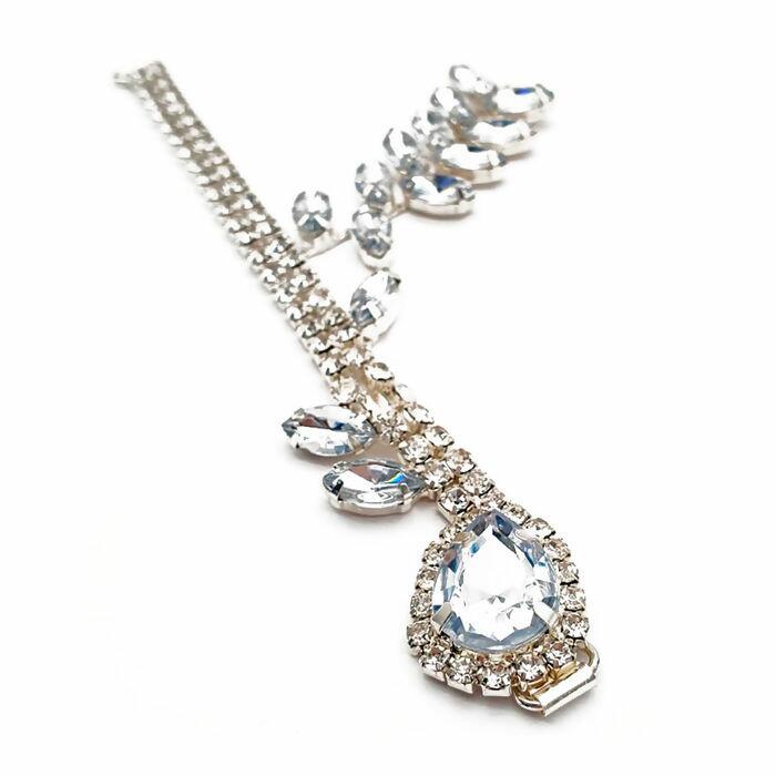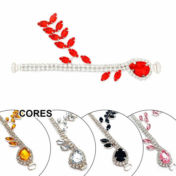 Cabedal para chinelo em pedrarias, peça sofisticada e de alta qualidade, ideal para transformar chinelos simples em sandálias exclusivas e elegantes. Produzido em base metálica prateada com pedras em formato navete e gota, possui brilho intenso que valoriza qualquer calçado.