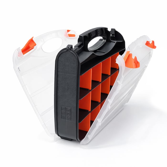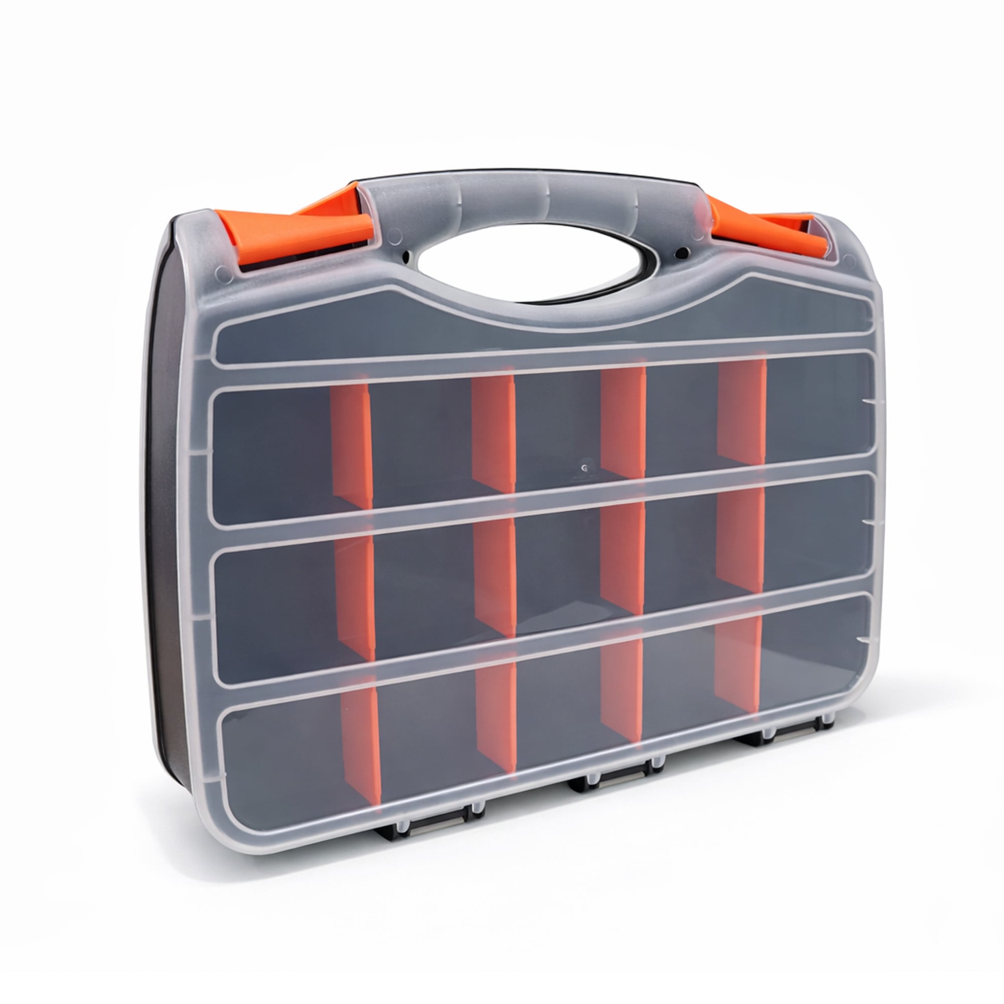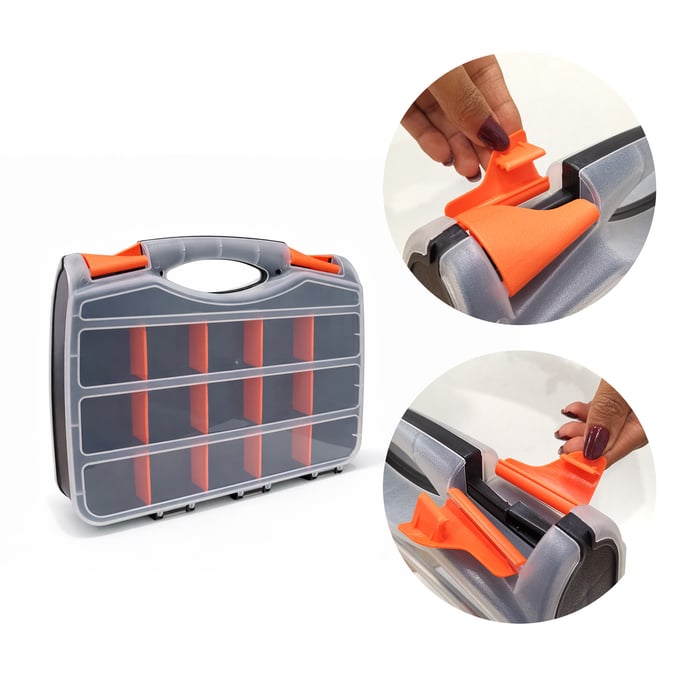 Os divisores internos (na cor laranja) permitem montar o layout conforme o tamanho das peças — desde parafusos até aviamentos delicados.