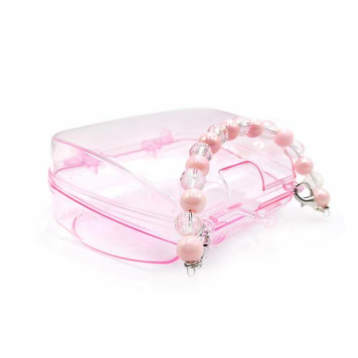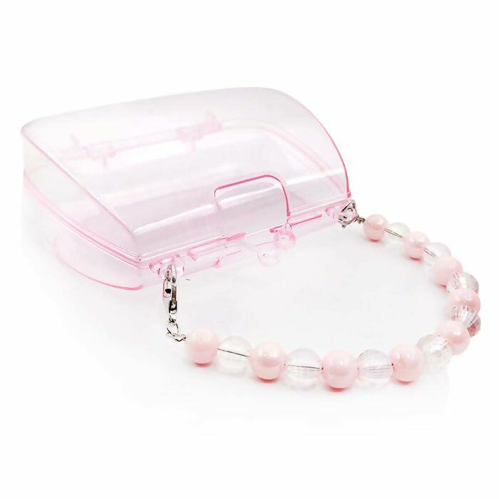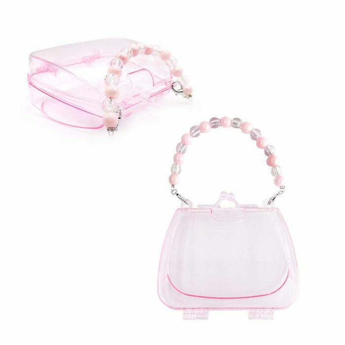 A Caixa Organizadora Bolsa é um item de armazenamento compacto e prático, ideal para guardar e organizar materiais pequenos, como pérolas, botões, linhas e alfinetes. A caixa é feita de plástico e tem uma cor rosa vibrante.
