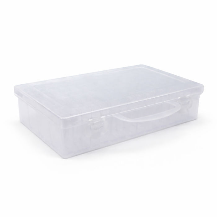 Fabricada em plástico resistente, possui tampa articulada com travas, garantindo fechamento firme e proteção no dia a dia. Transparente, agiliza a rotina: bateu o olho, achou.