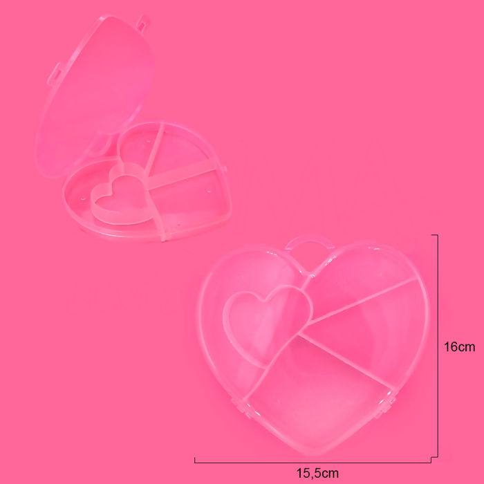 Descrição Caixa organizadora coração - 15,5cm x 16cm - 5 divisórias - Transparente - UT.833