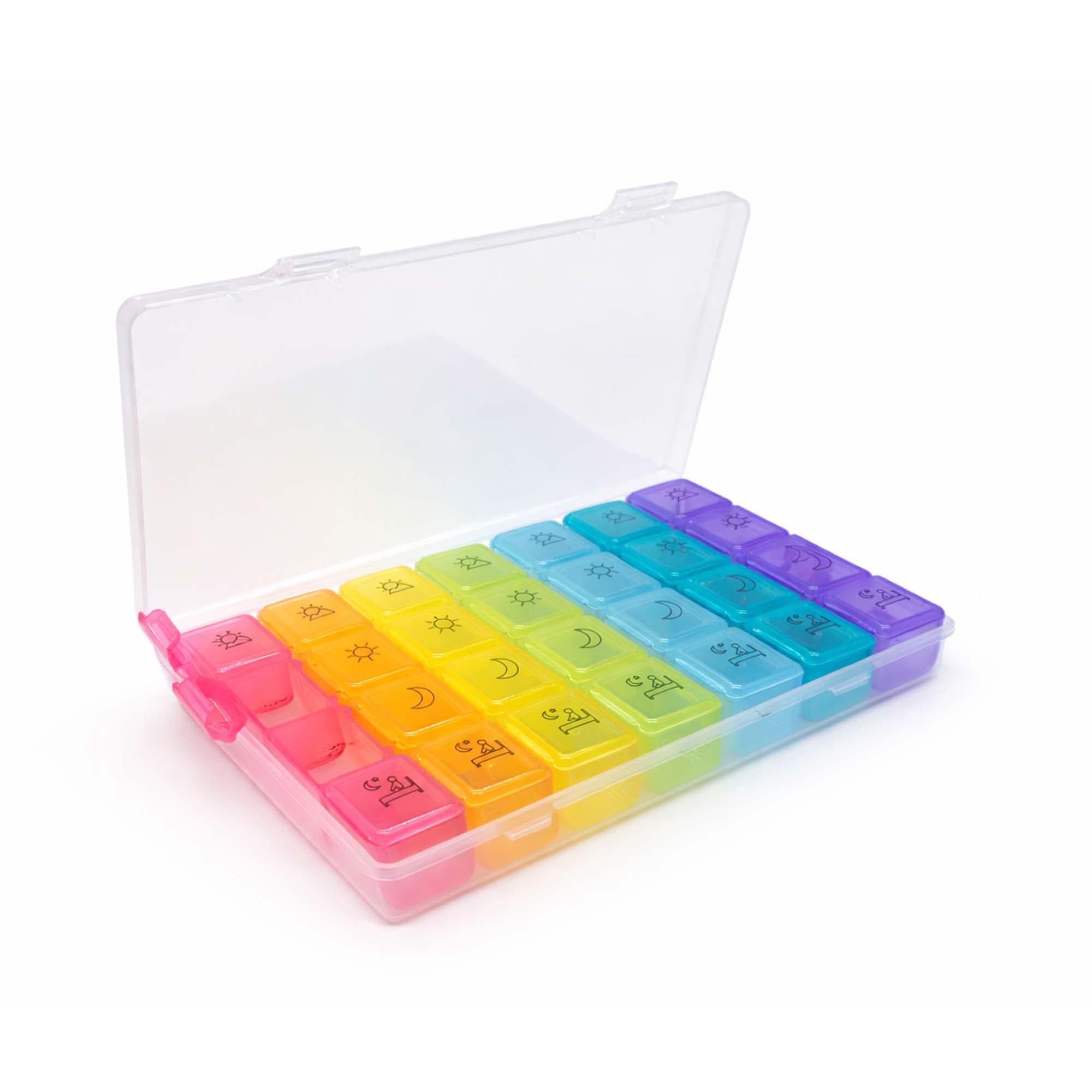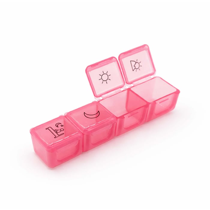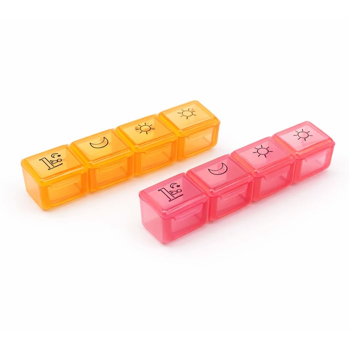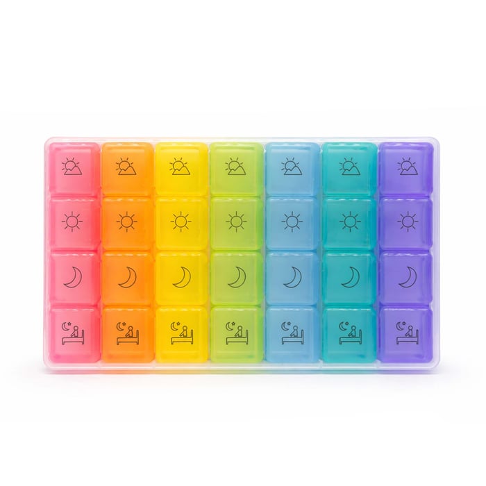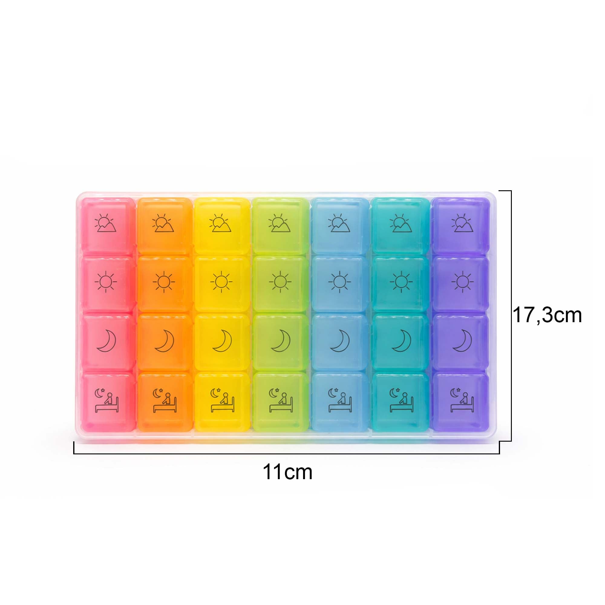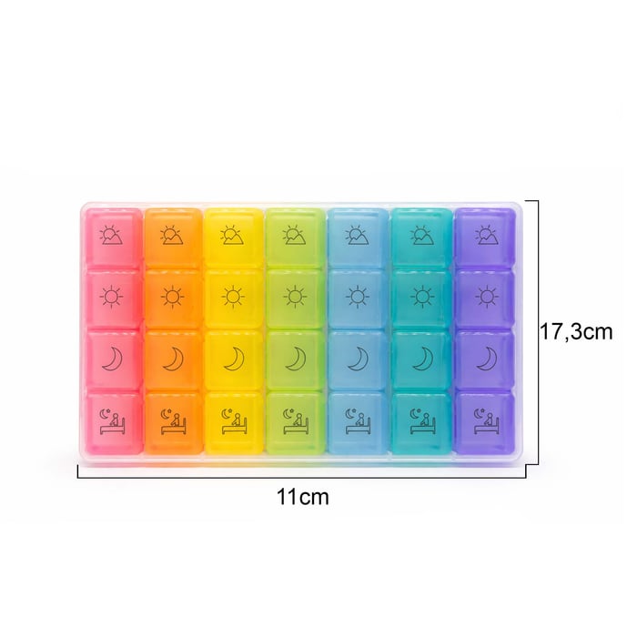 Seu visual colorido com ícones facilita a identificação dos períodos (manhã, tarde, noite), tornando o uso ainda mais intuitivo. Produzida em 100% plástico, é leve, resistente e perfeita para uso diário ou para levar na bolsa sem ocupar espaço.
