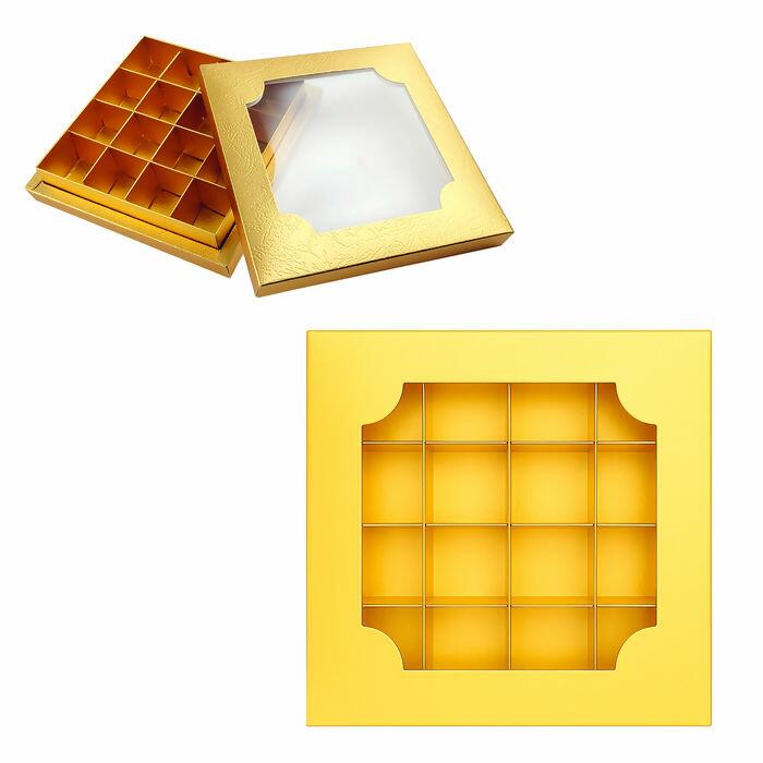 Descrição Caixa para Doces Dourada 18cm x 18cm x 3,8cm 16 Divisórias RO.154454