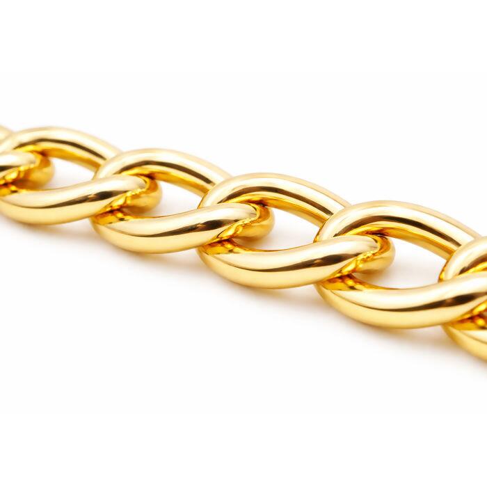 A corrente de alumínio dourado 12,1mm é imponente, moderna e feita para quem quer impacto visual imediato. Com elos largos e acabamento dourado brilhante, entrega presença premium sem pesar na peça, graças à leveza do alumínio. Ideal para criações que precisam se destacar no primeiro olhar.