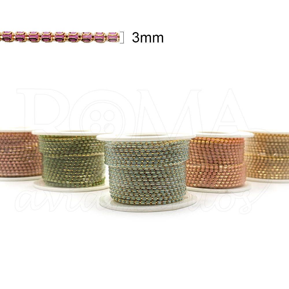 Aqui na Roma Aviamentos você encontra corrente de pedras perfeita para acabamentos em roupas, tecidos, bijuterias, potes e outros diversos objetos. Nossa correntes possuem diversas cores super brilhantes e fáceis de trabalhar.