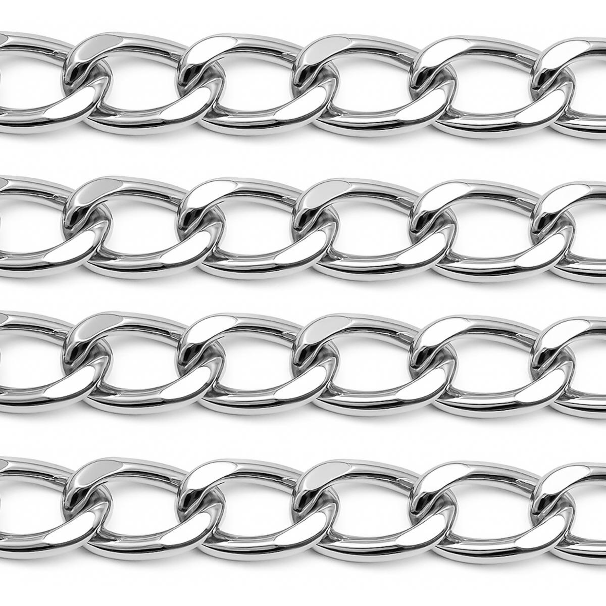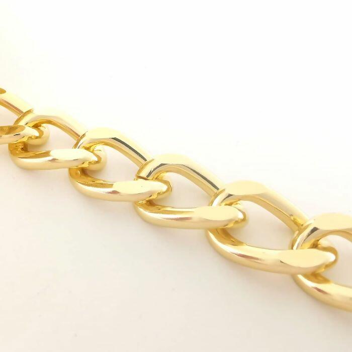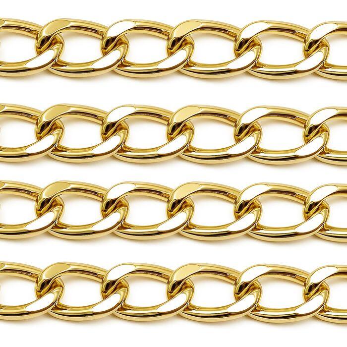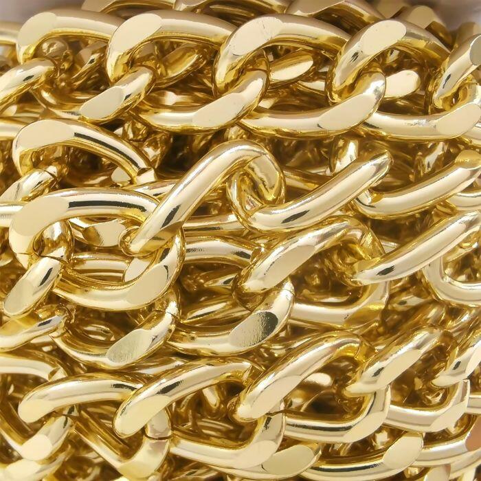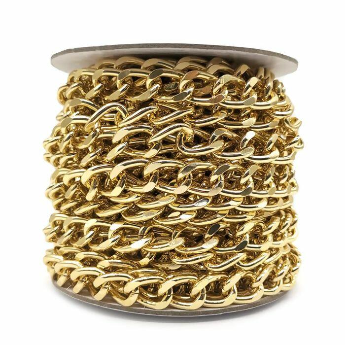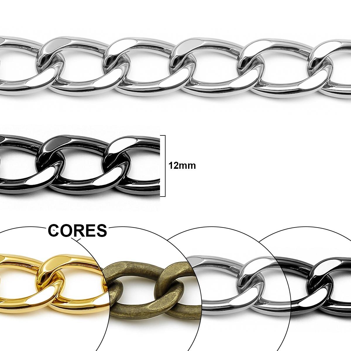Corrente resistente e leve, fabricada em alumínio de alta qualidade, ideal para confecção de bolsas, alças, bijuterias e artesanatos em geral. Disponível em quatro acabamentos sofisticados: dourado, níquel, ônix e ouro velho, garantindo versatilidade para diferentes estilos e combinações.