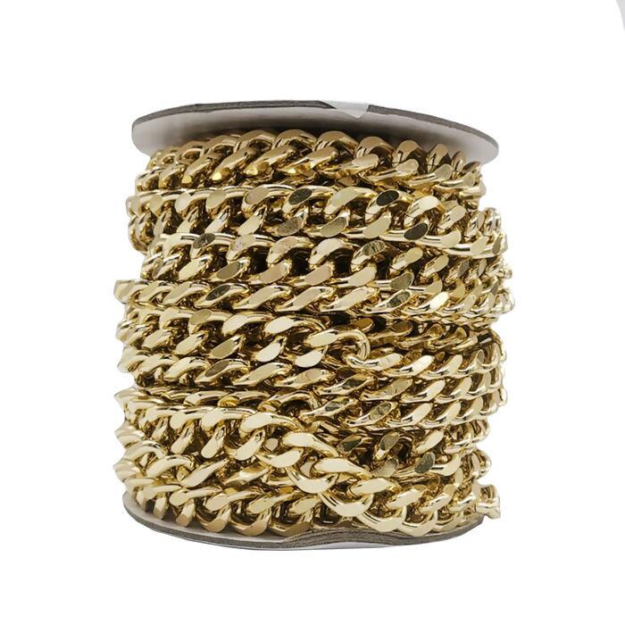 Corrente resistente e leve, fabricada em alumínio de alta qualidade, ideal para confecção de bolsas, alças, bijuterias e artesanatos em geral. Disponível em quatro acabamentos sofisticados: dourado, níquel, ônix e ouro velho, garantindo versatilidade para diferentes estilos e combinações.