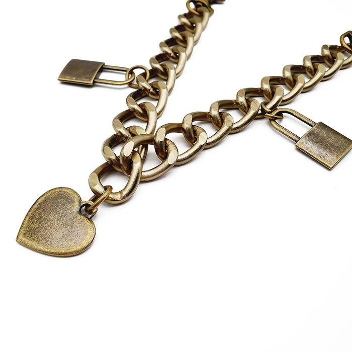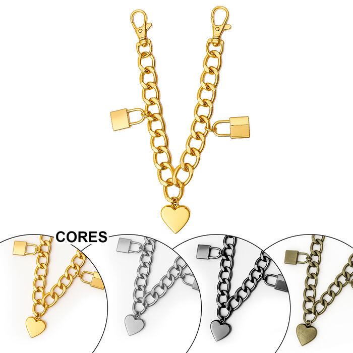 A corrente para bolsa 30cm é o acessório ideal para quem busca praticidade e estilo em suas criações. Fabricada em material metálico resistente, possui fecho mosquetão nas extremidades, facilitando a aplicação em bolsas, necessaires, carteiras e chaveiros. O design inclui elos grossos e pingentes decorativos em formato de coração e cadeado, trazendo um toque moderno e elegante.