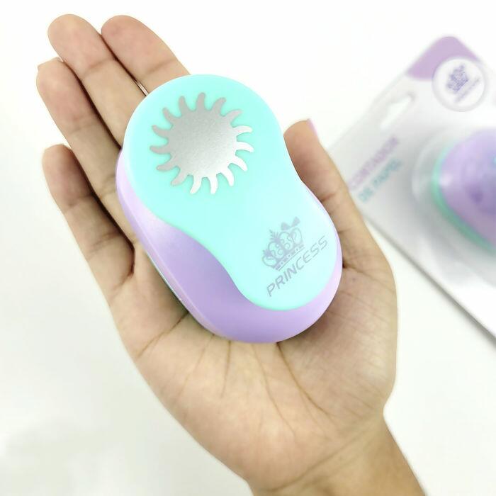 Descrição Cortador de Papel - Sol - Princess - 7,3cm x 4,5cm - Lilás/Verde - UT.1206