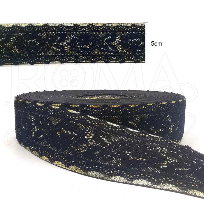 Descrição Elástico com Renda - 5cm x 25y - Preto / Dourado - RO.110035