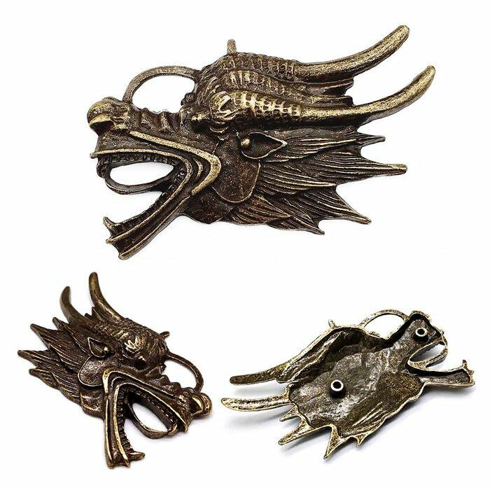 Descrição Enfeite de Metal Cabeça de Dragão 5cm x 8,3cm Ouro Velho RO.154040