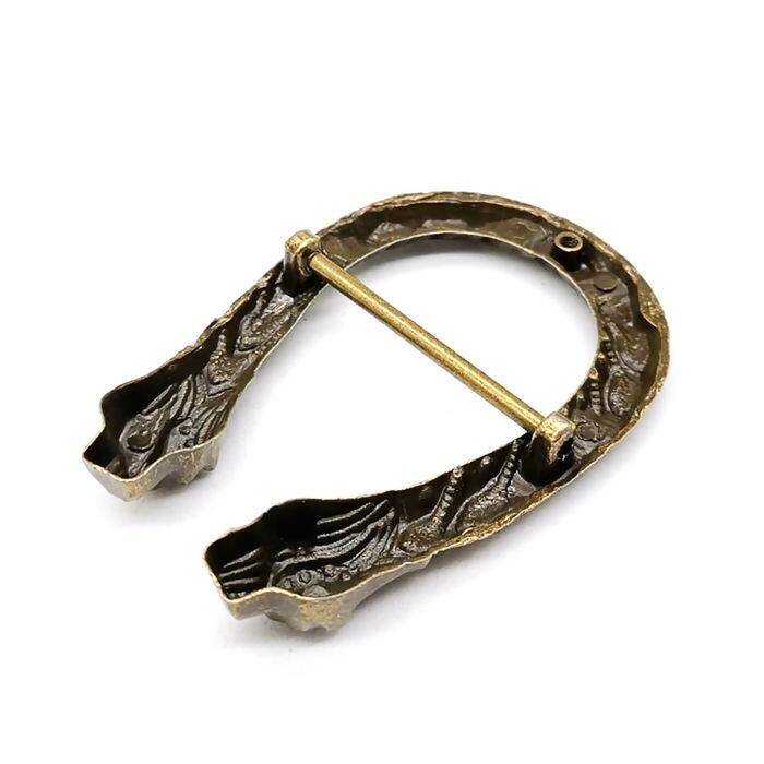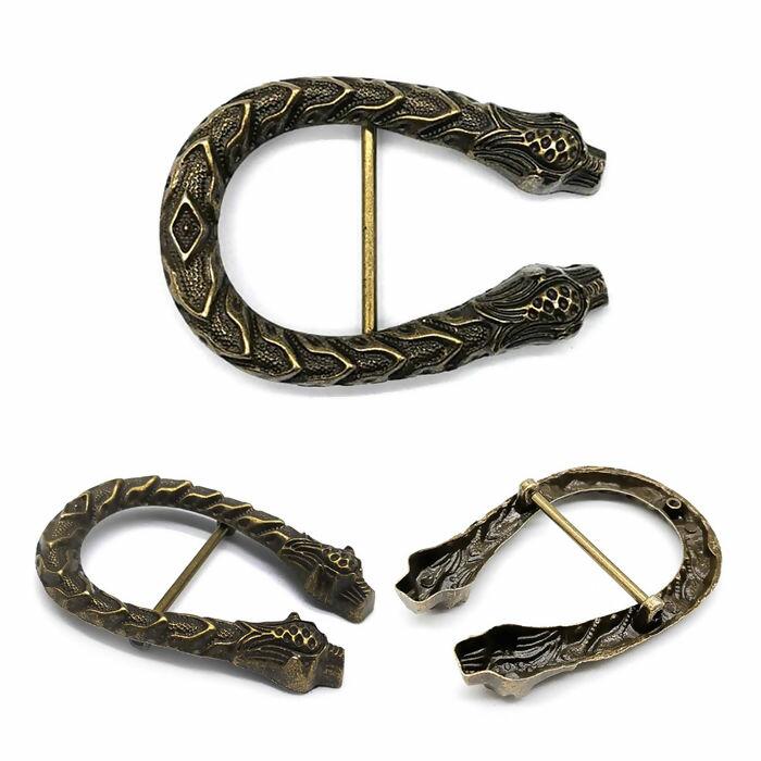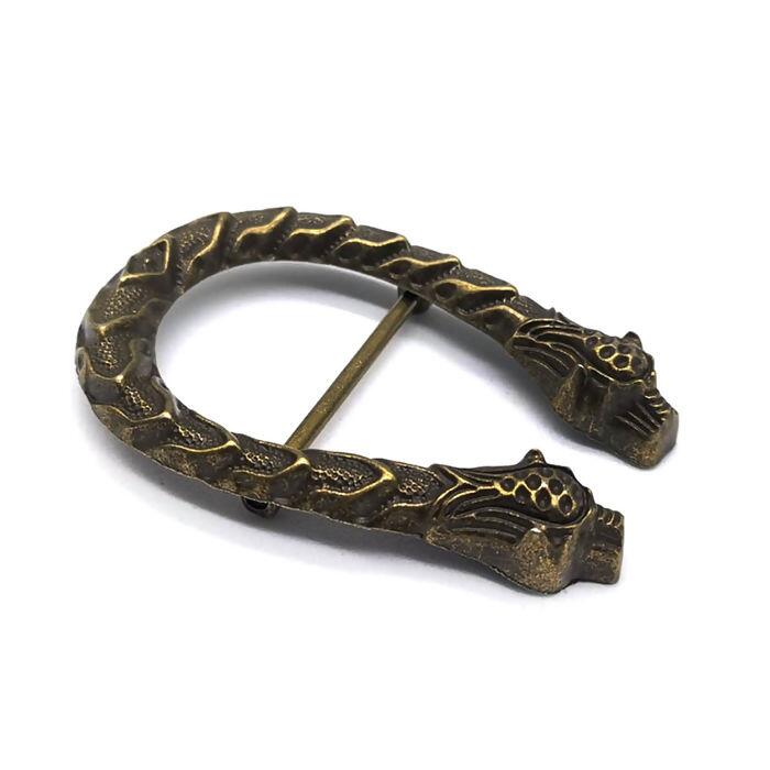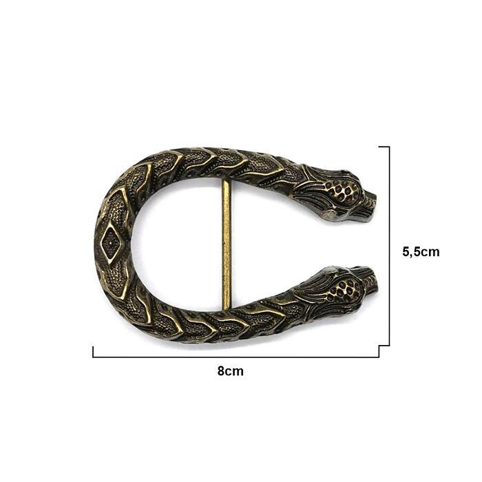 Peça robusta em metal com design detalhado de duas cabeças de dragão nas extremidades, acabamento ouro velho e textura em alto-relevo que valoriza o estilo. Conta com passante e pino metálico removível, ideal para aplicações em bolsas, cintos, mochilas e projetos artesanais sofisticados.