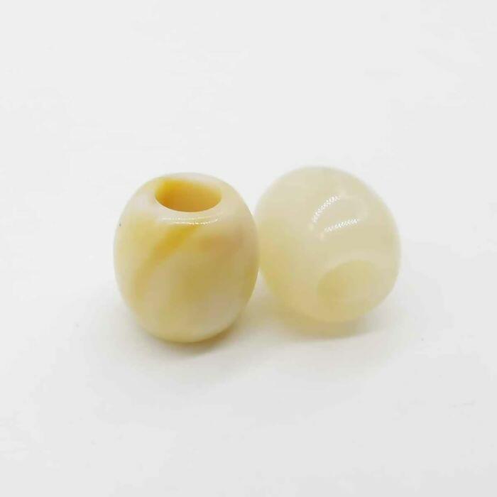 Pedras resinadas em tonalidade bege, com efeito marmorizado;