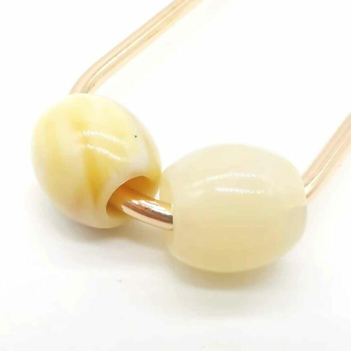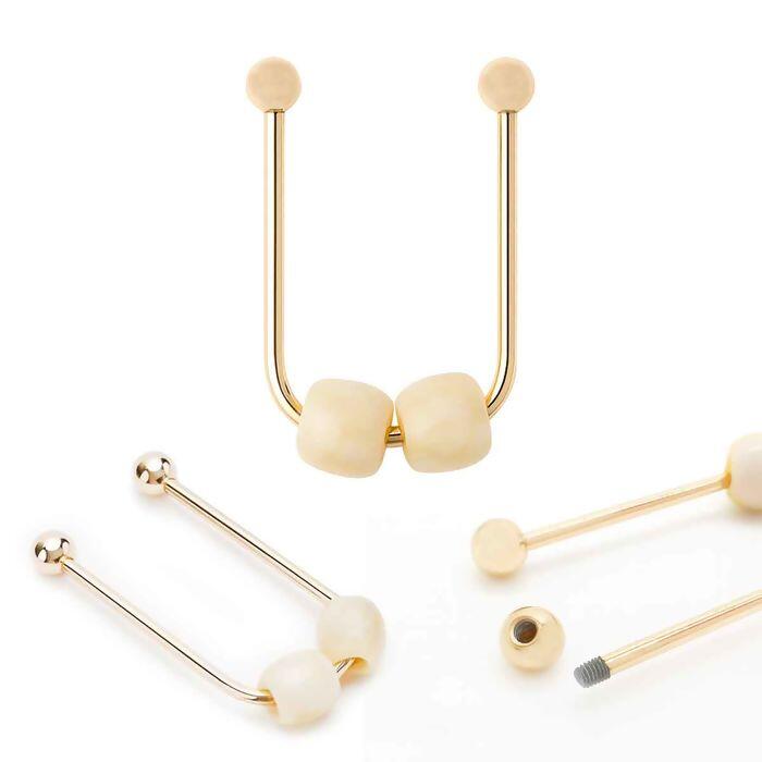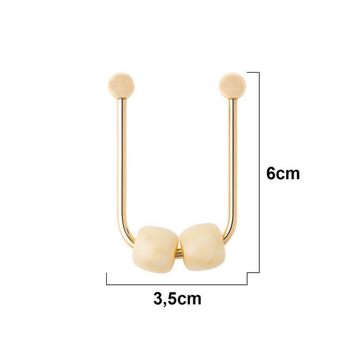 Este enfeite é feito em metal com banho dourado e acompanha duas pedras resinadas em tom bege perolado, que conferem um toque sofisticado e delicado. Seu formato em “U” proporciona praticidade no uso, já que possui fechamento com esferas rosqueáveis, garantindo segurança e fácil manuseio.