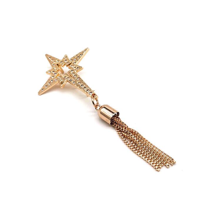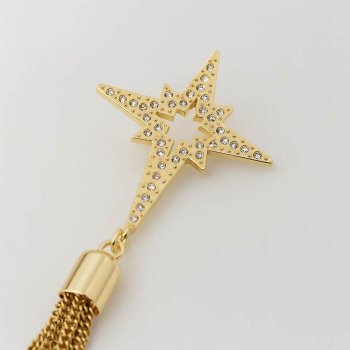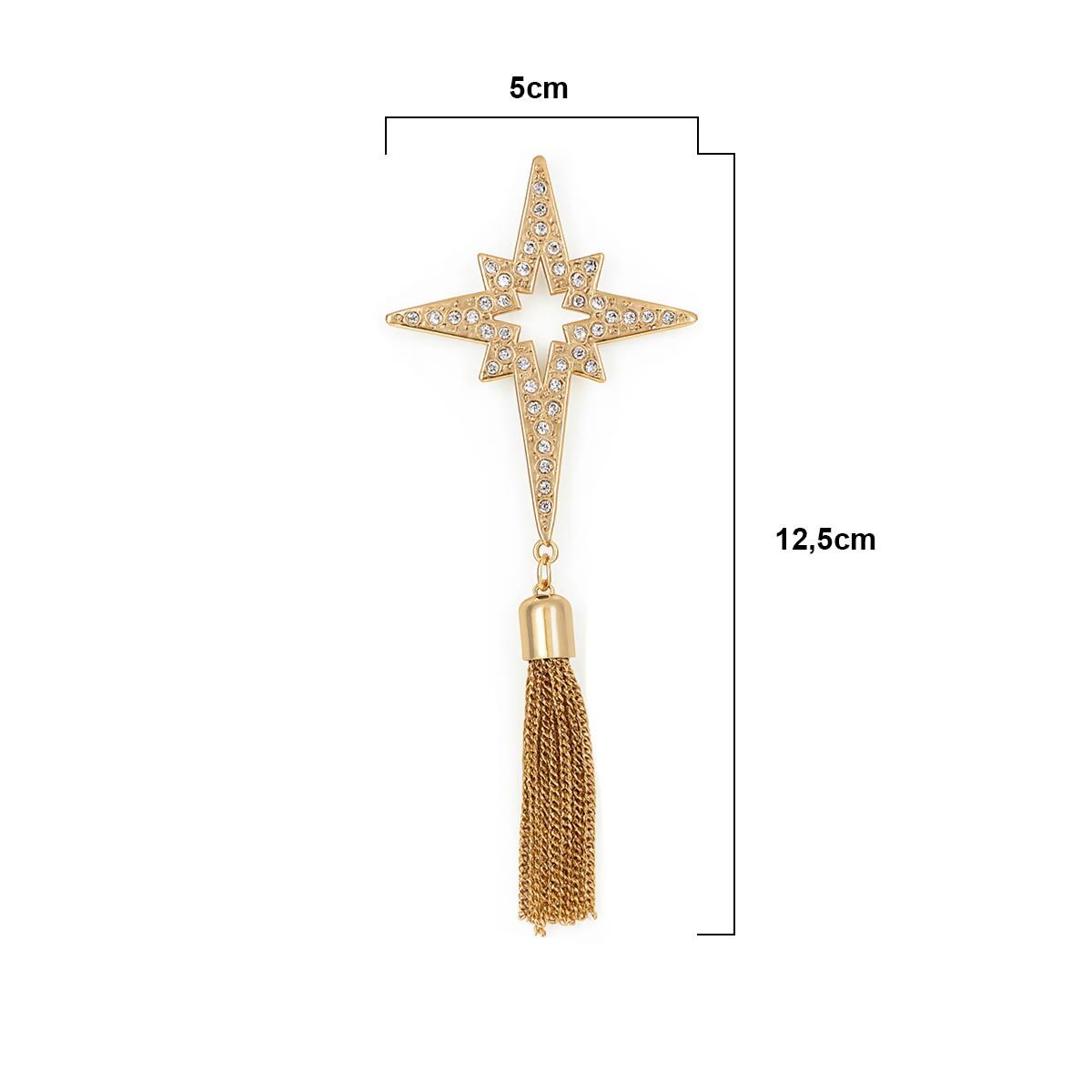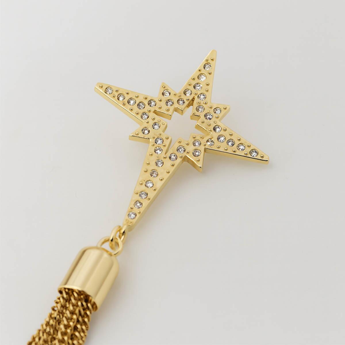 Enfeite de metal para bolsa em formato de estrela com acabamento em strass e detalhe de franja em corrente dourada. Uma peça sofisticada que transforma bolsas simples em acessórios de luxo.