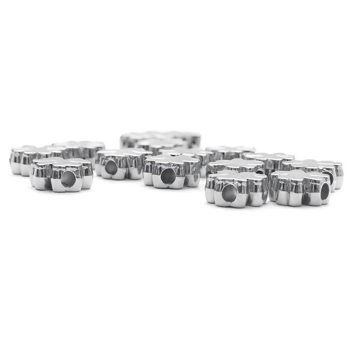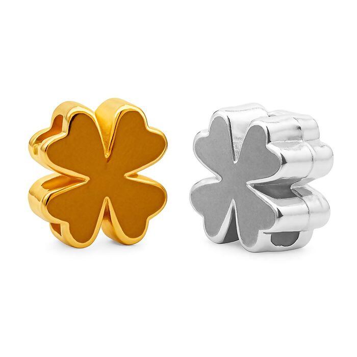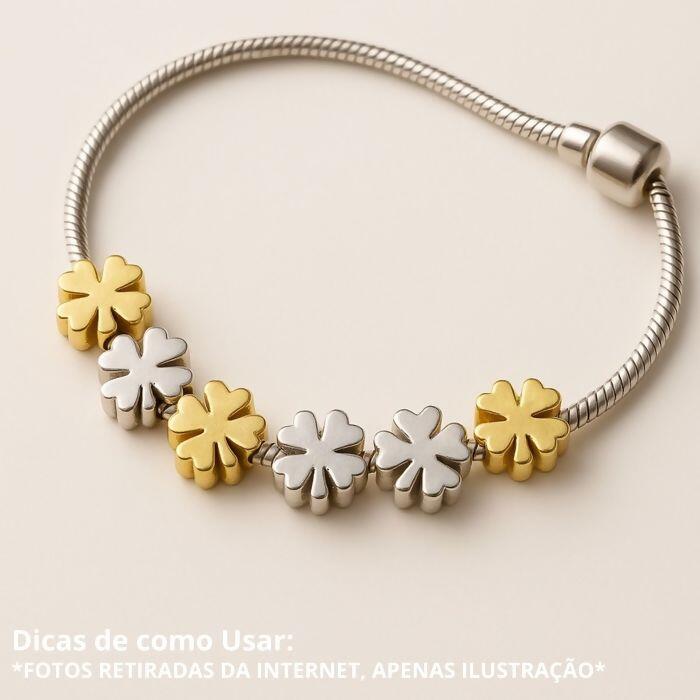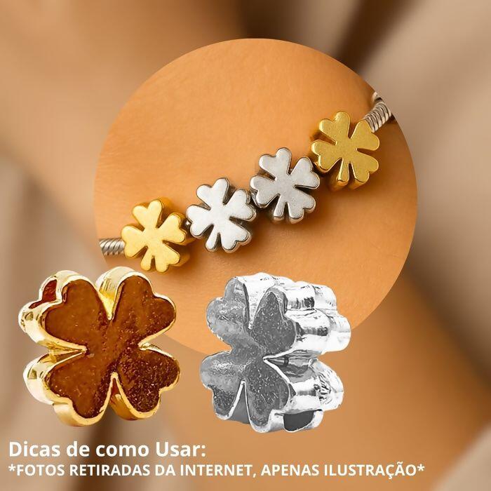 O entremeio trevo é um acessório produzido em plástico resistente, com banho metalizado em dourado e níquel. Seu design em formato de trevo de quatro folhas simboliza sorte e é perfeito para trazer um toque especial em colares, pulseiras, brincos e outros acessórios artesanais.