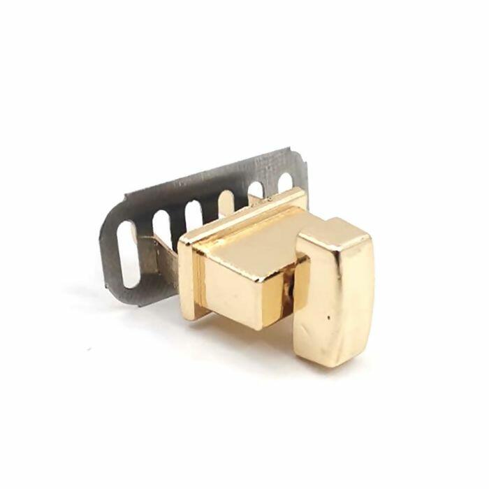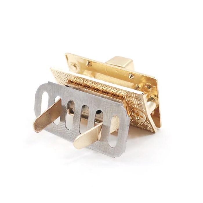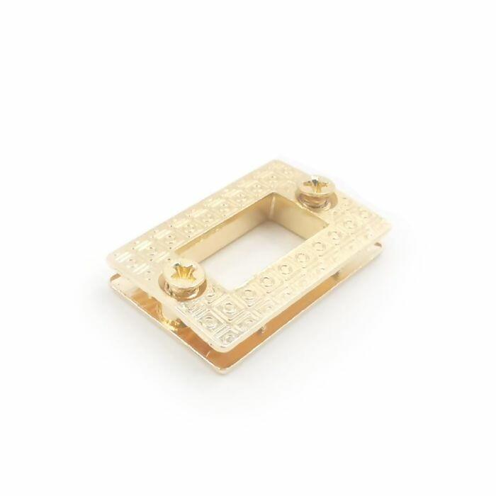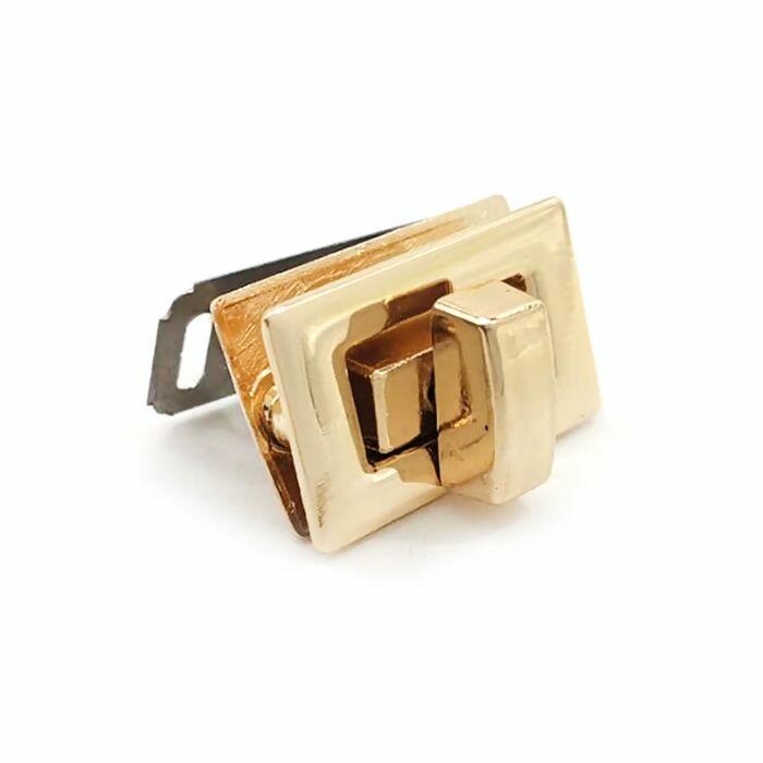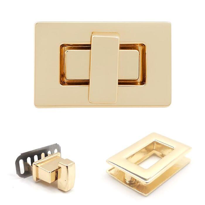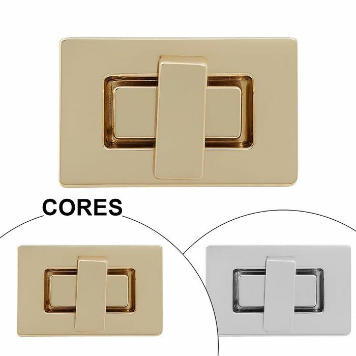 O fecho é um acessório elegante e resistente, perfeito para bolsas artesanais, pastas e carteiras que necessitam de um acabamento sofisticado. Seu design retangular com fecho giratório central proporciona segurança no fechamento e um visual moderno. Disponível em dourado e níquel, combina durabilidade e estilo em qualquer projeto.