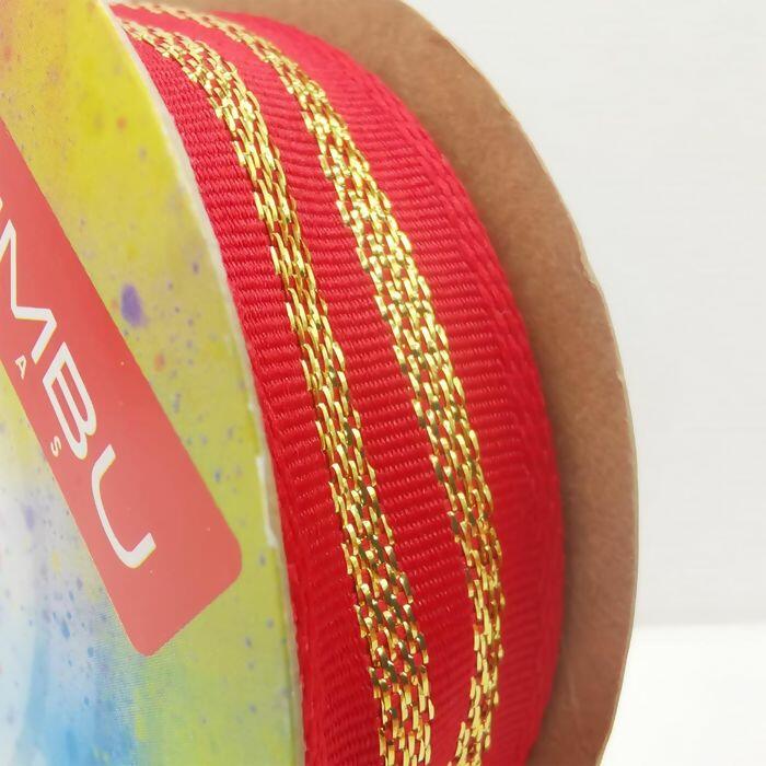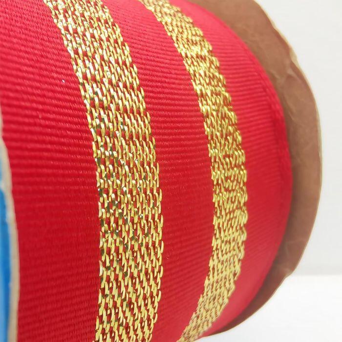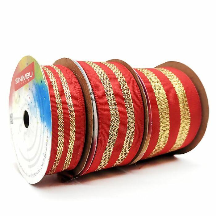 Descrição Fita Aramada Sinimbu Vermelha com Listras Douradas 10m 1996