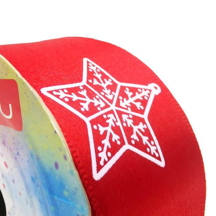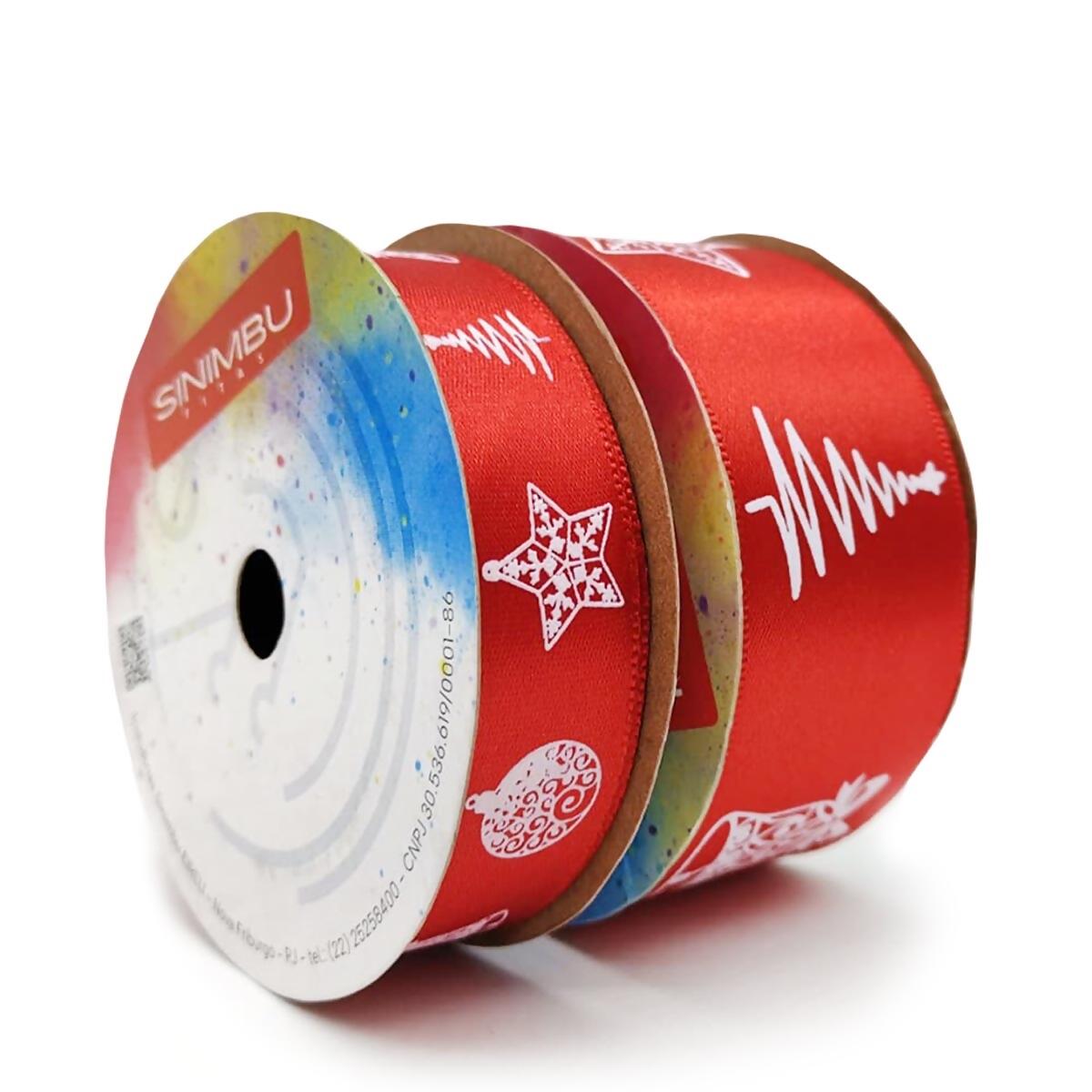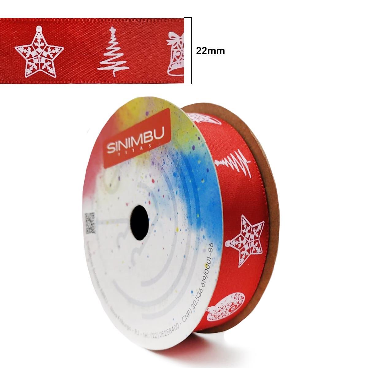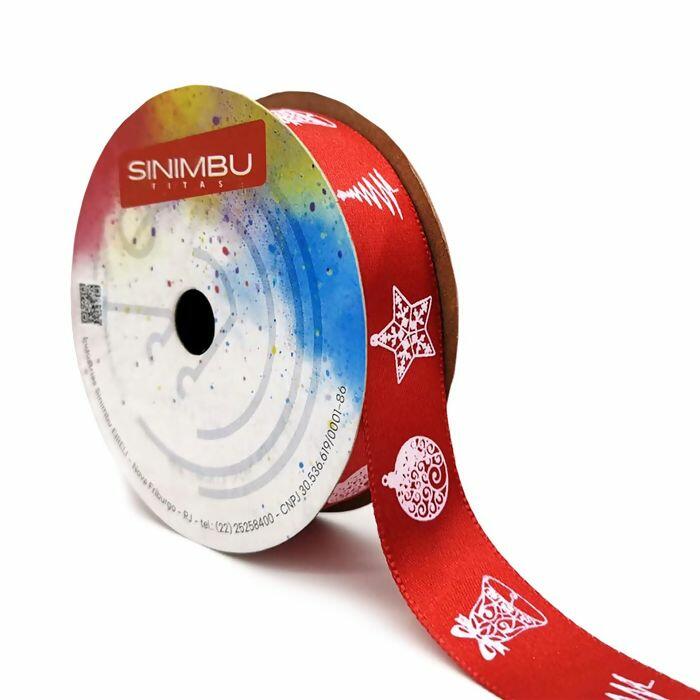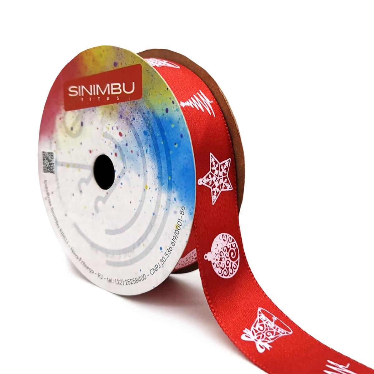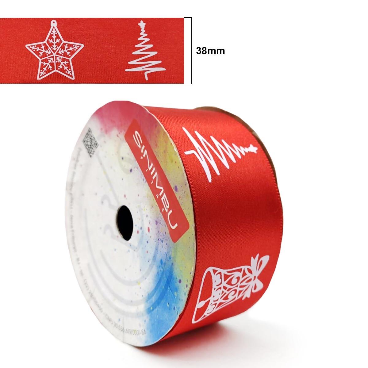 A fita de cetim natalina Sinimbu é perfeita para deixar suas criações com o charme e o brilho do Natal. Com estampa temática em branco sobre fundo vermelho, traz símbolos clássicos como estrela, pinheiro e sino, ideais para valorizar embalagens, laços e decorações festivas.