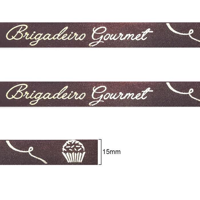 Fita estampada em dourado de cetim marrom chocolate, ideal para diversos tipos de artesanatos, laços em geral, embalagens. Sendo um produto de ótima qualidade que irá agregar valor em suas criações.