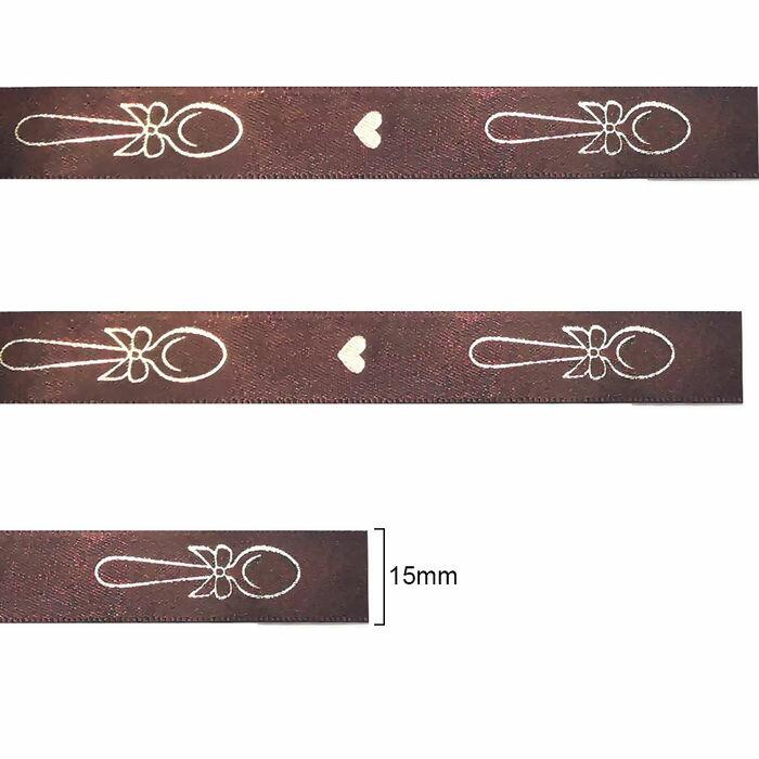 Fita estampada em dourado de cetim marrom chocolate, ideal para diversos tipos de artesanatos, laços em geral, embalagens. Sendo um produto de ótima qualidade que irá agregar valor em suas criações.
