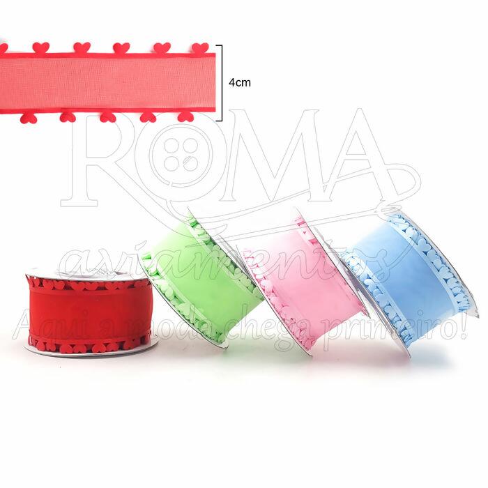 Aqui na Roma Aviamentos, você encontra fita com borda trabalhada perfeita para confecção de tiaras, presilhas encapadas, laços, embrulhos e muito mais. Esta fita possui um centro em tule e as bordas trabalhadas em coraçãozinho que deixa tudo muito mais encantador.
