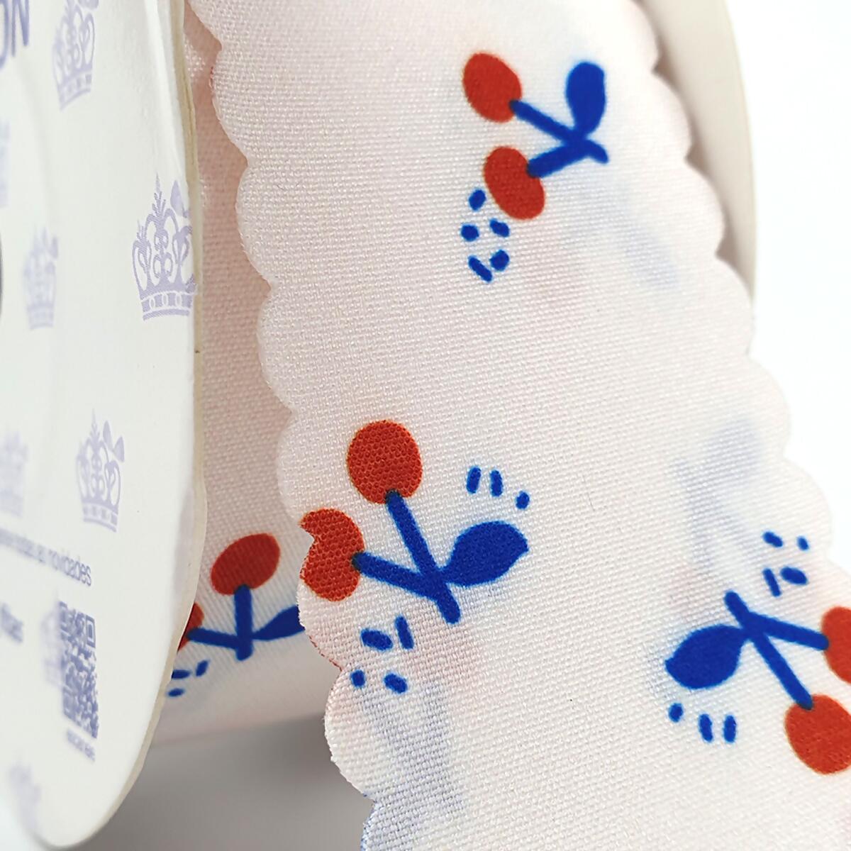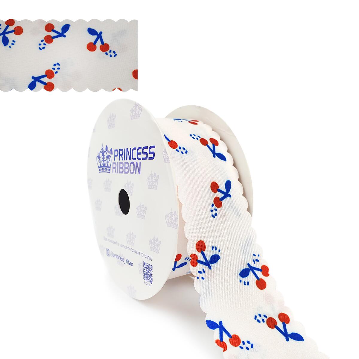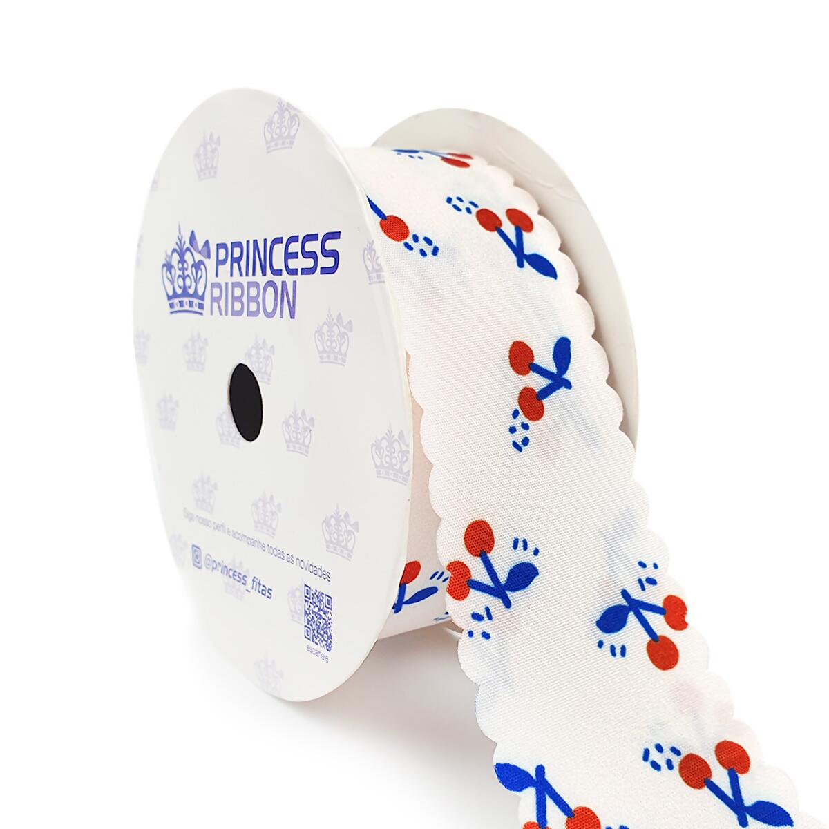 A fita estampada Princess cereja 38mm une delicadeza e estilo em um acabamento diferenciado. Com estampa minimalista de cerejas em tons de vermelho e azul sobre fundo claro e borda recortada, ela entrega um visual moderno, criativo e cheio de personalidade. De alta qualidade, possui toque macio, excelente definição da estampa e ótima estrutura para trabalhos refinados.
