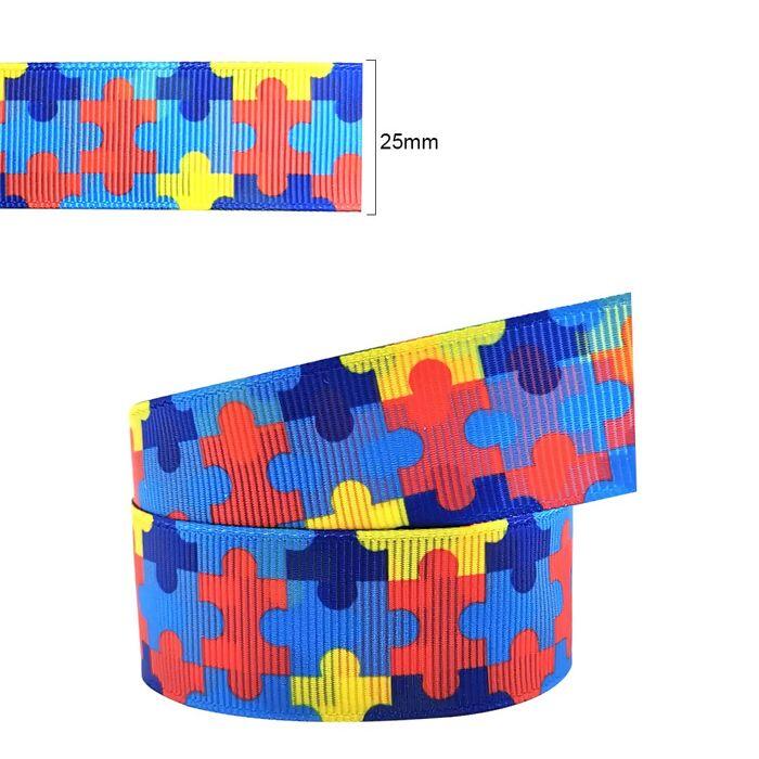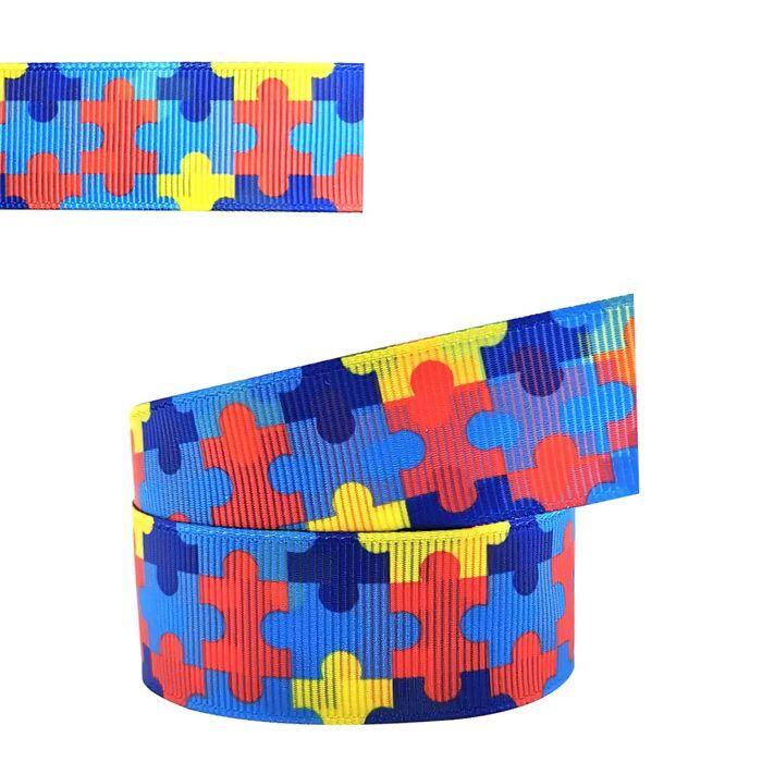 Fita estampada com o tradicional padrão quebra-cabeça do Autismo, com 25mm de largura e 10 metros de comprimento. Perfeita para projetos artesanais, laços e ações de conscientização.