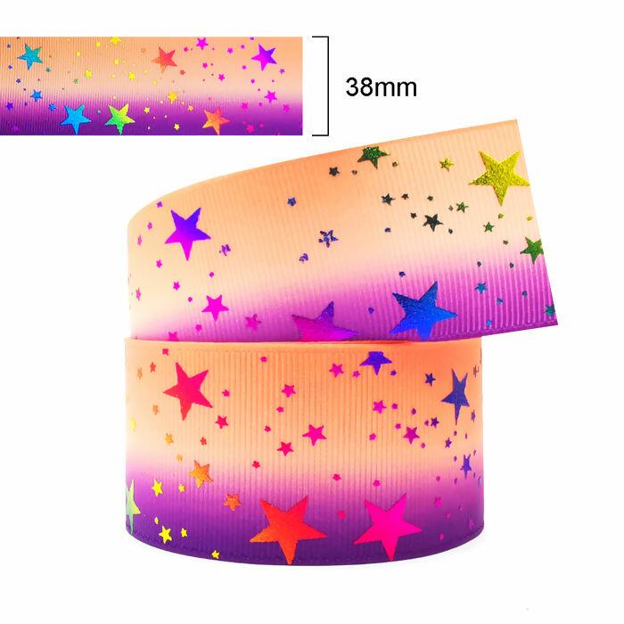 Descrição Fita gorgurão - Estrelas - 38mm x 10m - Degradê - Laranja e Roxo - RO.150027 - 046756