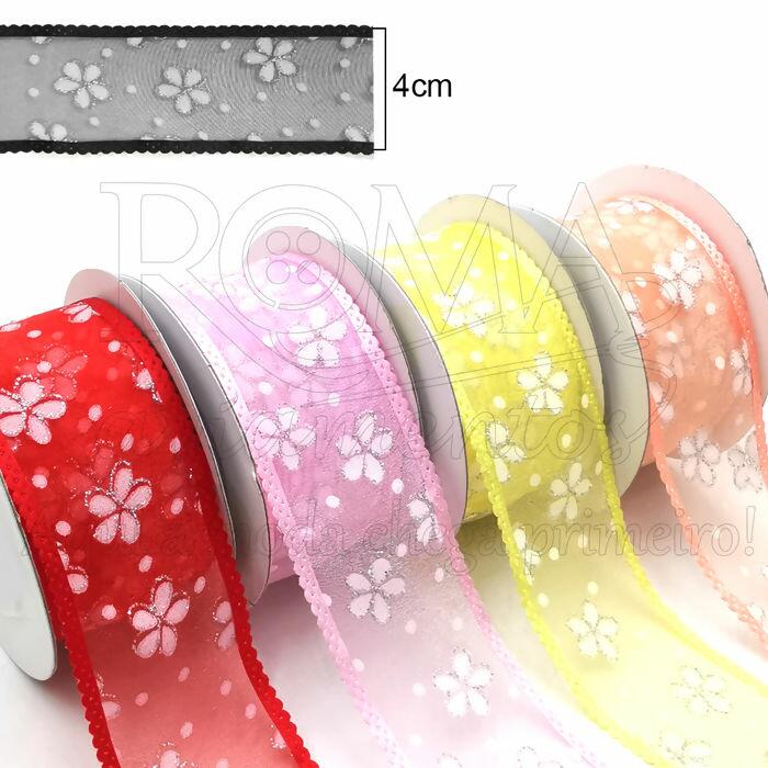 Aqui na Roma Aviamentos, você encontra fita com borda trabalhada perfeita para confecção de tiaras, presilhas encapadas, laços, embrulhos e muito mais. Esta fita possui um centro em organza com florzinhas estampadas em glitter, e as bordas trabalhadas.