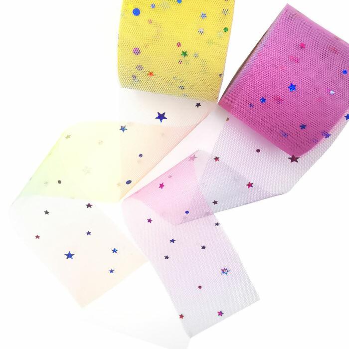 Fita tule multicor ideal para laços, artesanatos, perfeita para embalar presentes e decorar. Possuindo estrelinhas coloridas de confete e material super macio dando um ótimo acabamento em suas criações.