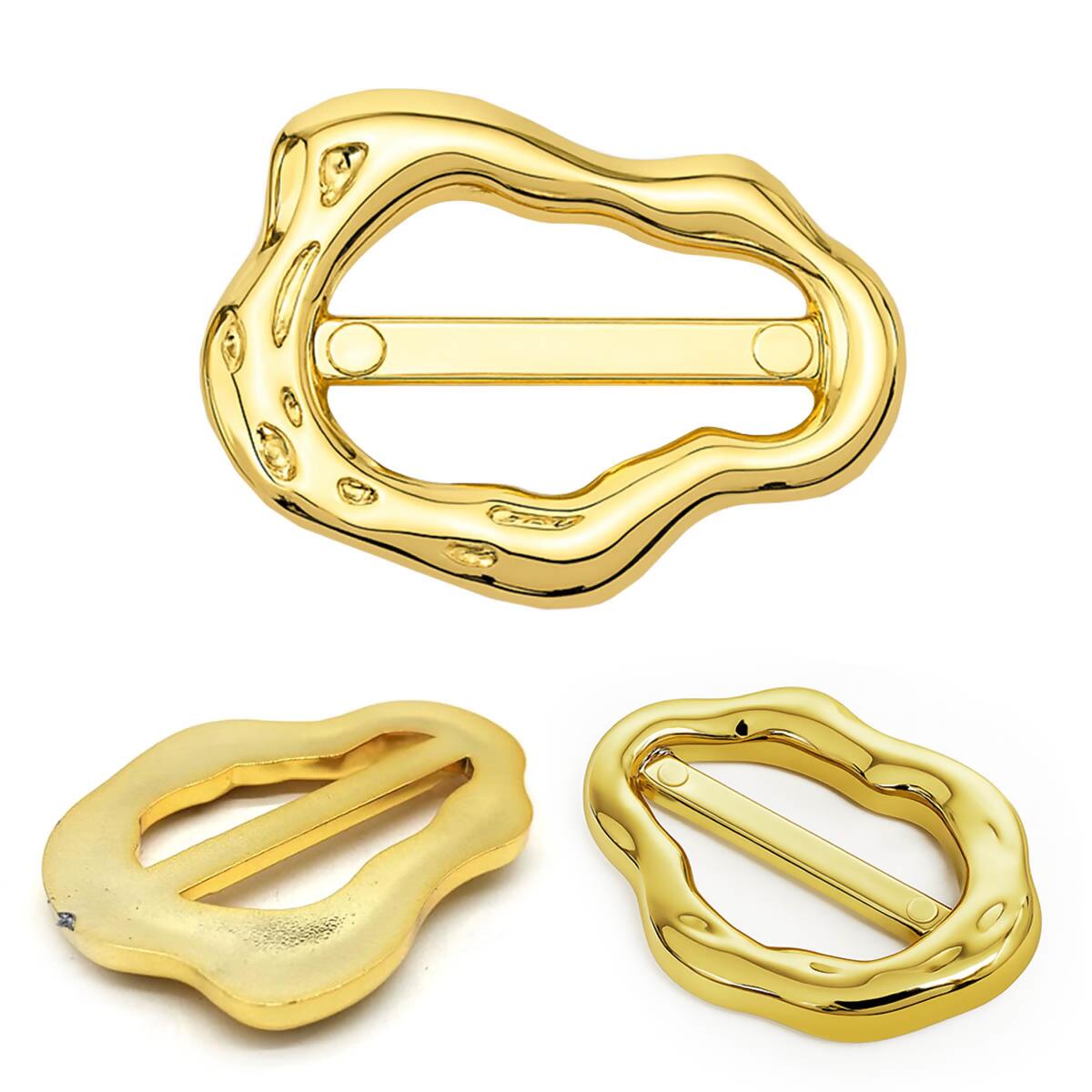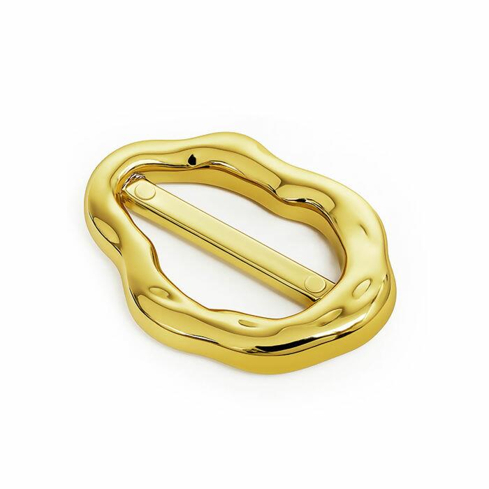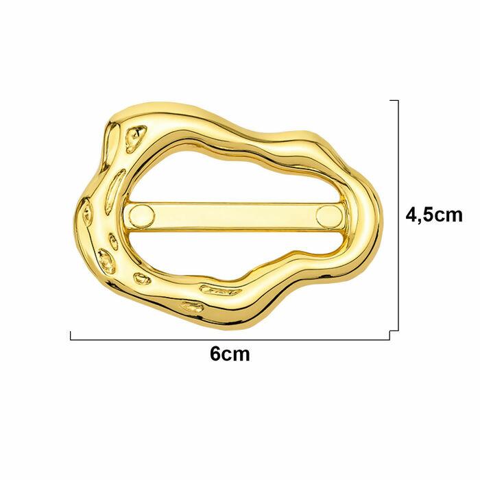 A fivela dourada é produzida em plástico ABS de alta qualidade, unindo leveza, resistência e acabamento sofisticado. Seu design orgânico com barra central facilita a aplicação em diferentes tipos de peças.