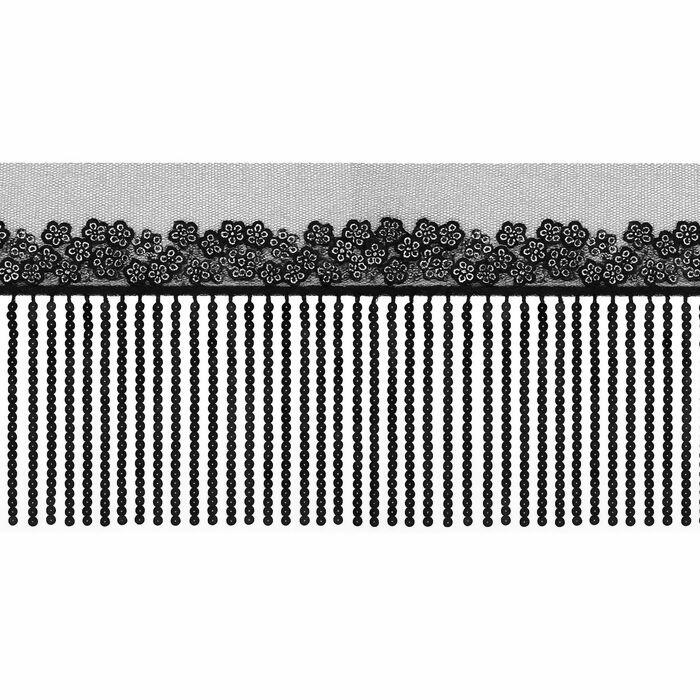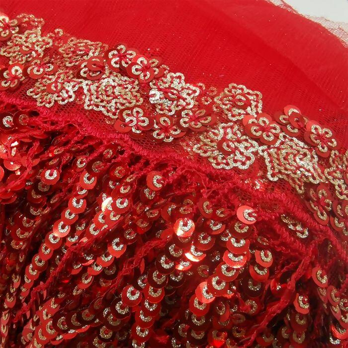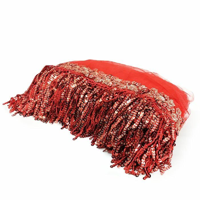 Material e construção: Base em tule leve com aplicação de paetês metalizados e franjas torcidas. A borda superior possui acabamento trançado com paetês costurados, garantindo firmeza e sofisticação.