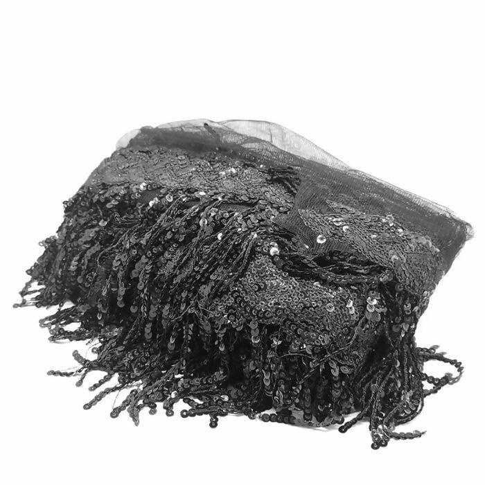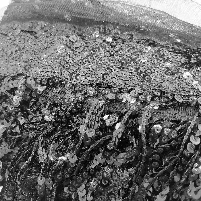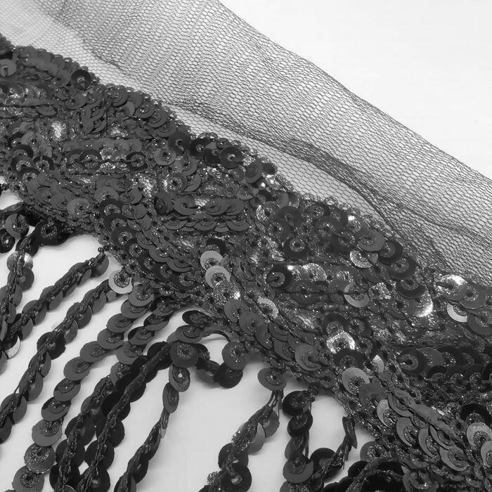 Material e construção: Base em tule leve com aplicação de paetês metalizados e franjas torcidas. A borda superior possui acabamento trançado com paetês costurados, garantindo firmeza e sofisticação.