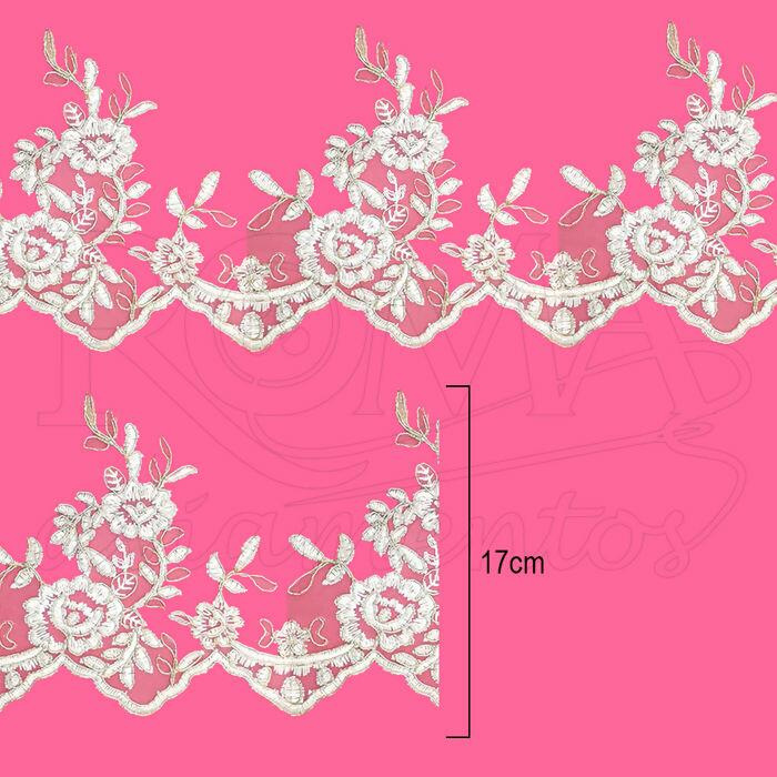 Descrição Guipir Noiva de Poliéster - 17cm x 15y - Branco/Dourado - RO.151071