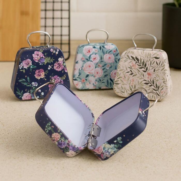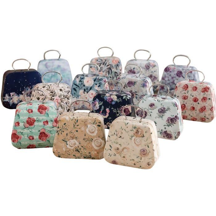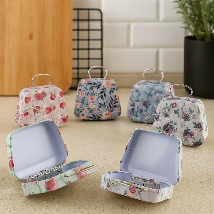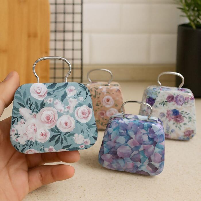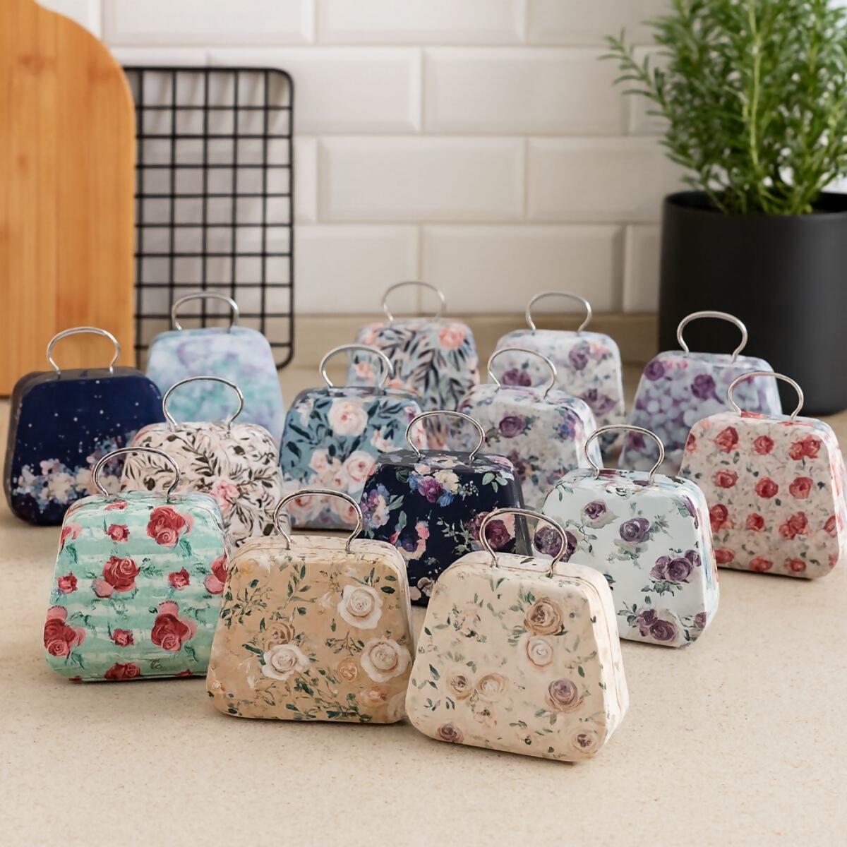 As Mini Latas Decorativas em formato de bolsinha Ref. RO.154427 são perfeitas para quem quer unir organização, lembrancinha e artesanato em um só produto. Com estampa floral delicada e alça metálica, elas dão aquele toque especial em festas, presentes e na decoração do dia a dia.