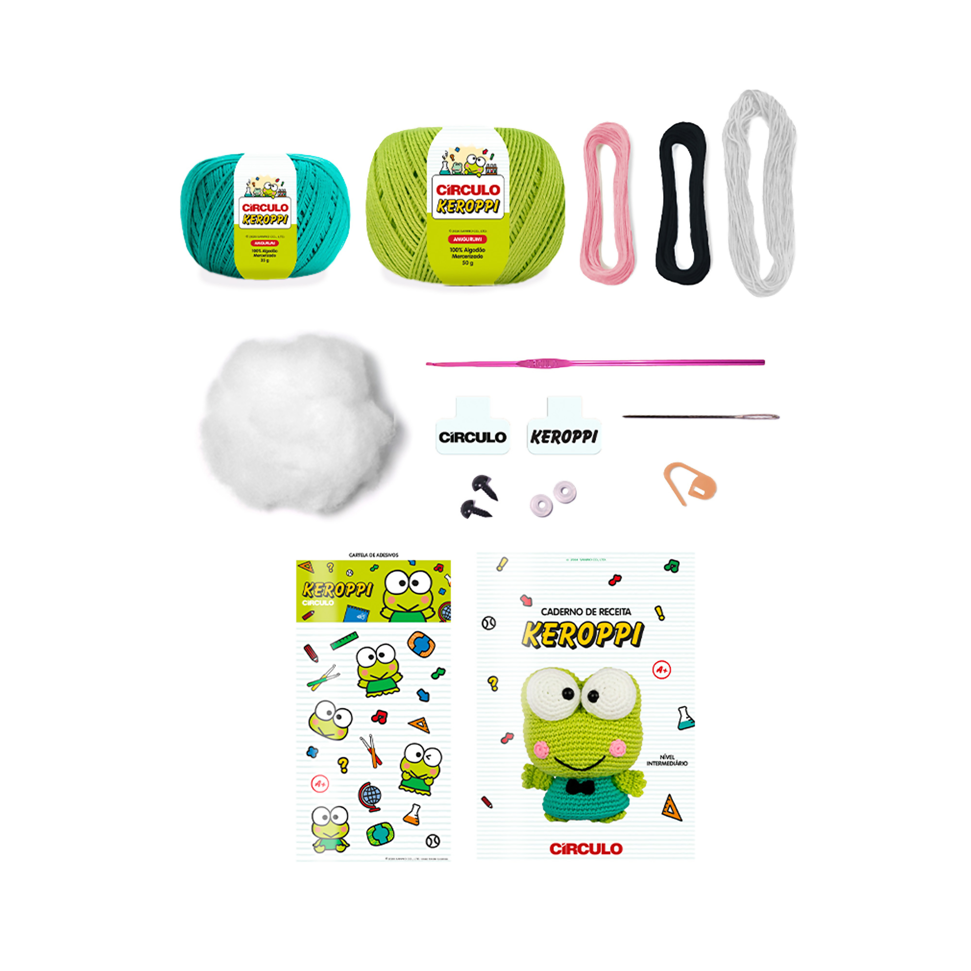 Conteúdo completo (fios, enchimento, olhos, agulhas e acessórios)