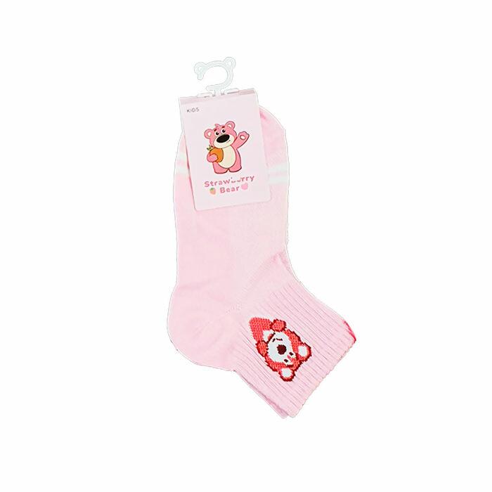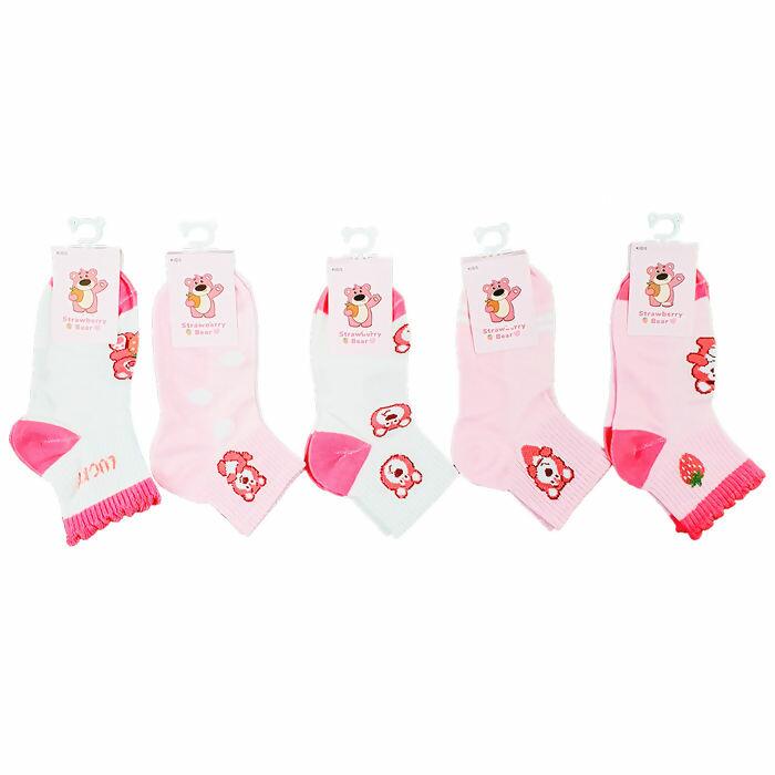 Kit com 10 pares de meias infantis femininas com estampa de ursinho morango (Strawberry Bear). 5 modelos diferentes com 2 pares cada. Rosa e branco, macias e estilosas.